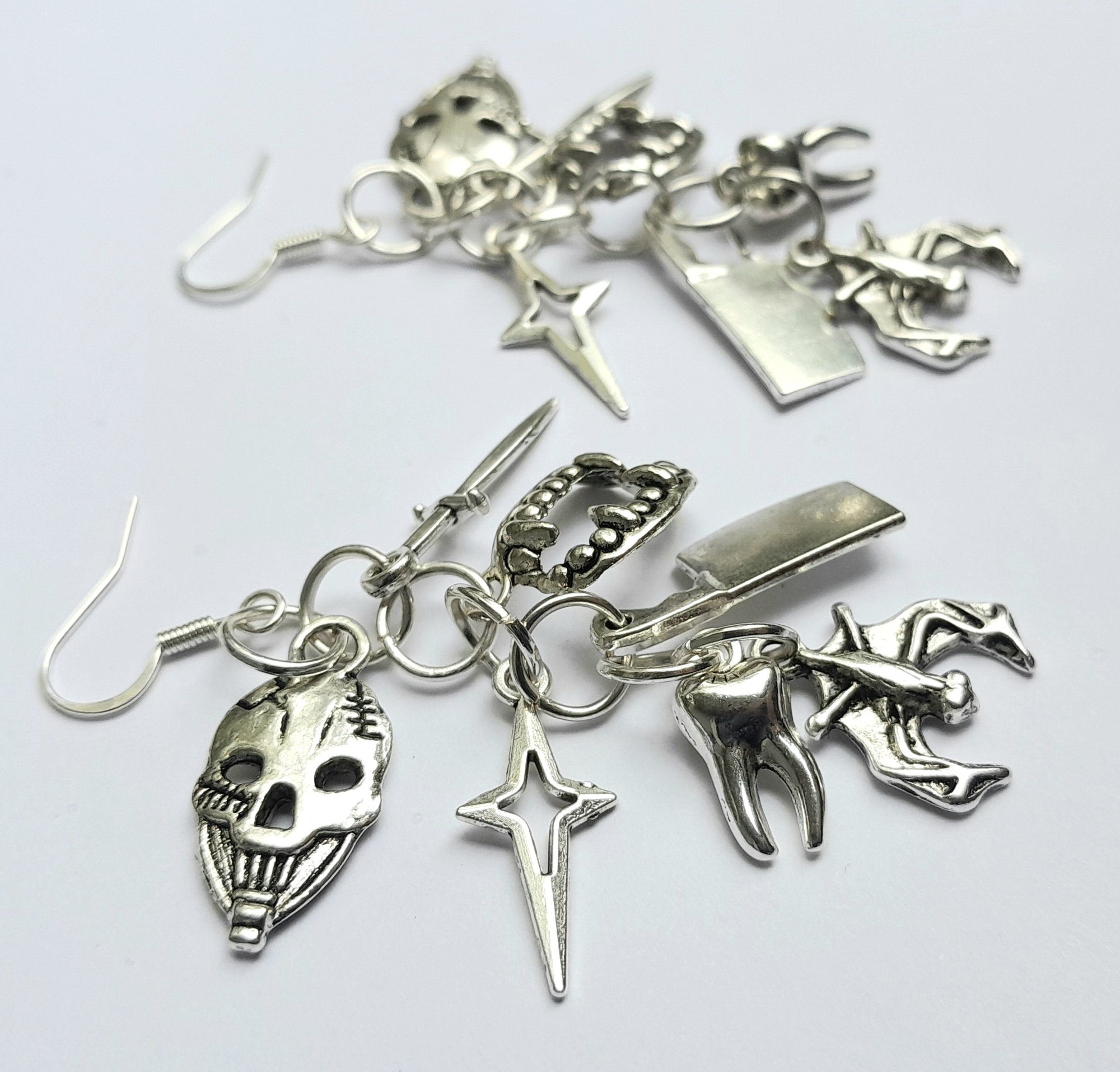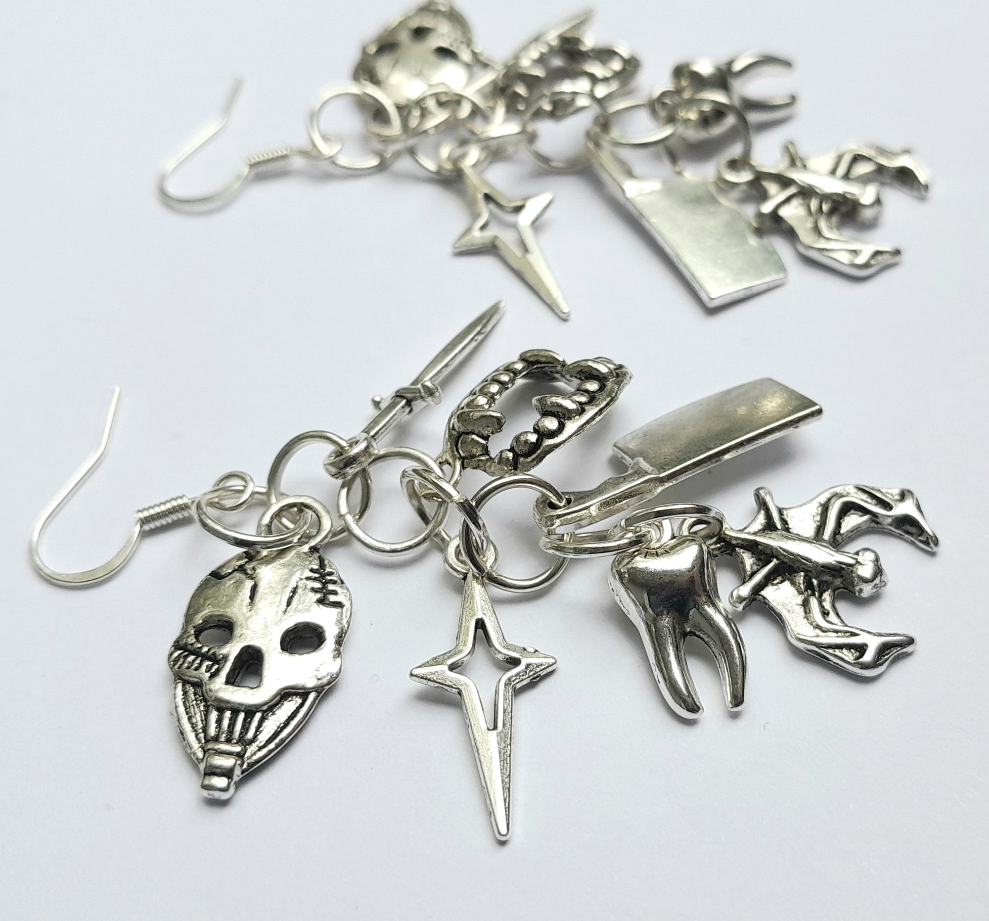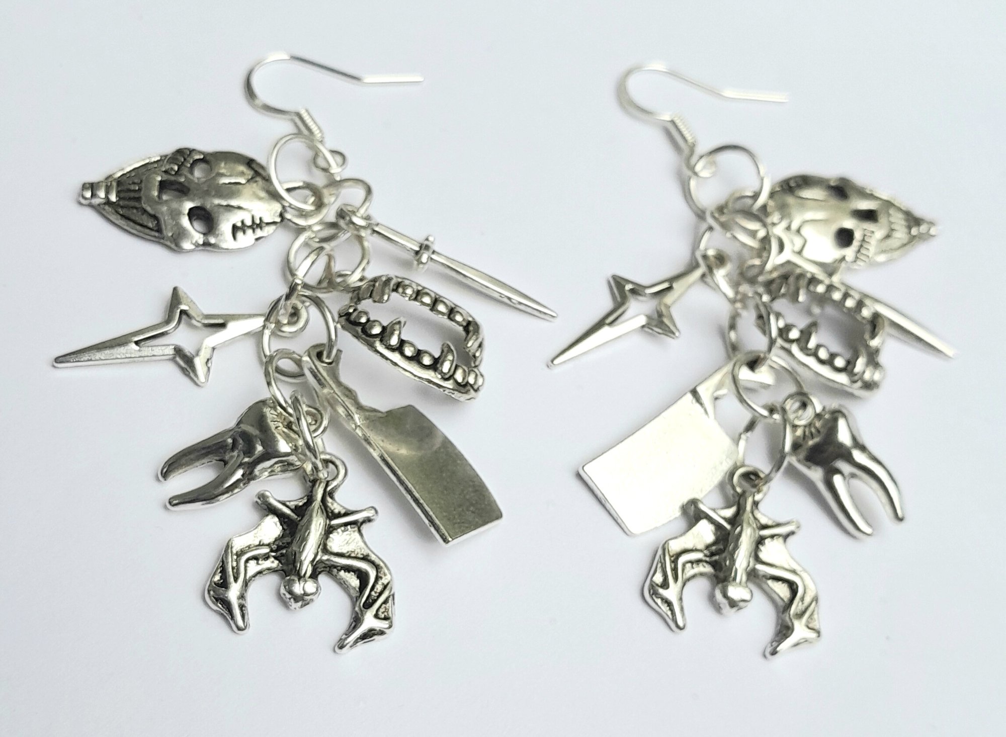 Pair of handmade earrings with dagger, cleaver, bat, tooth, mummy, vampire teeth, star charms with stainless steel jump rings and iron hooks.