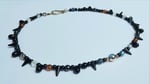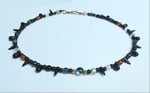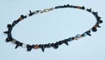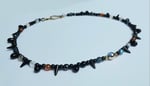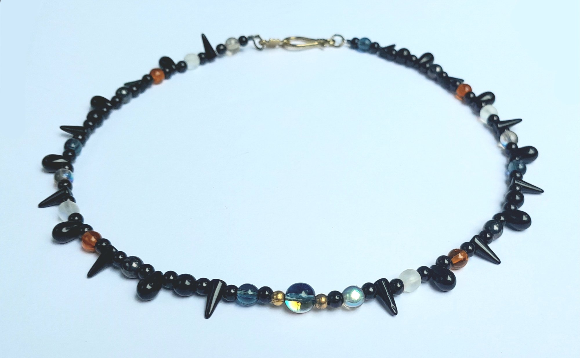 19" necklace with multicoloured glass, black glass teardrops and spikes and an antique gold-coloured hook clasp.