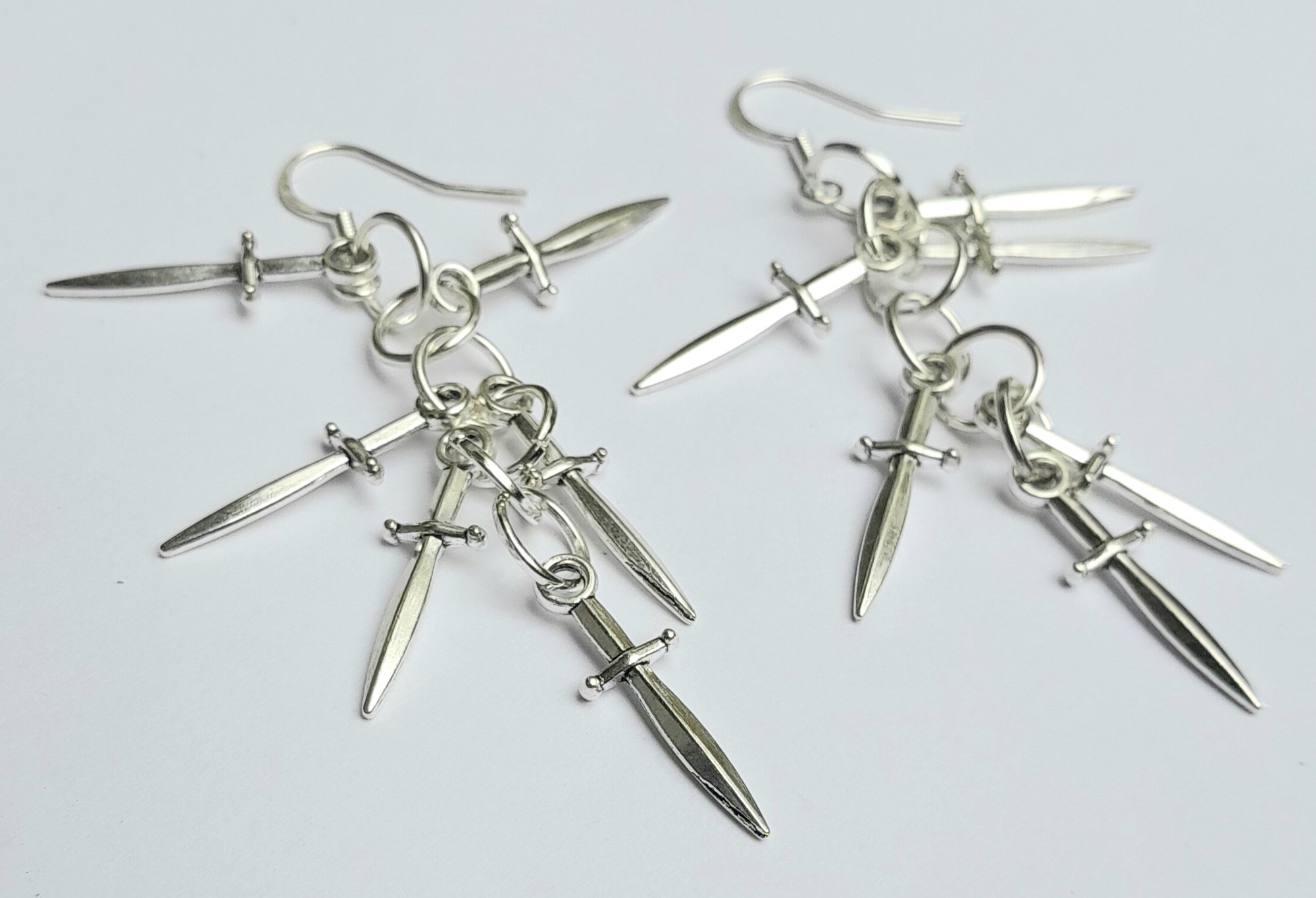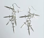 Pair of handmade earrings with stainless steel daggers, jump rings and iron hooks.