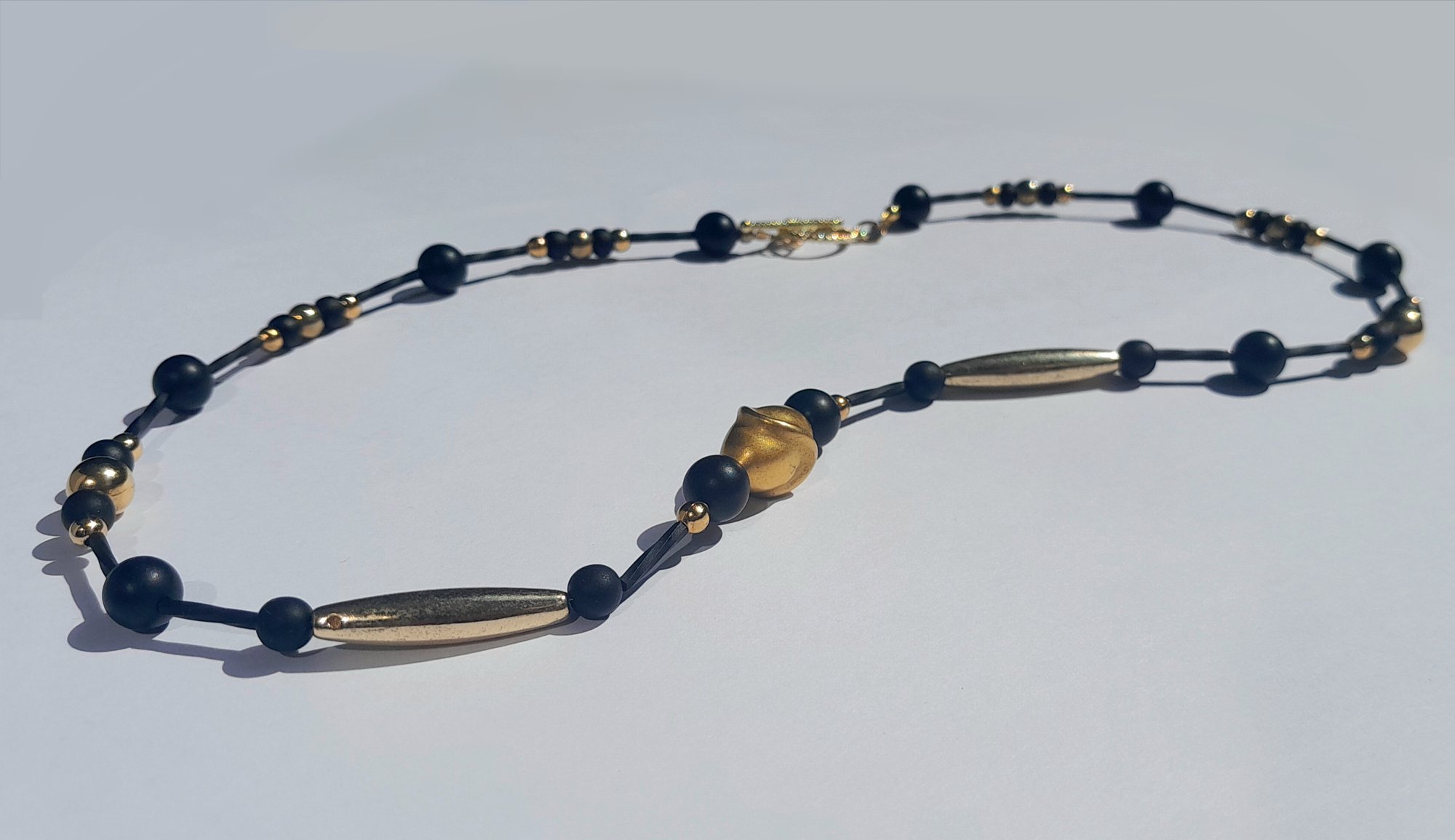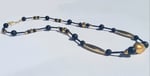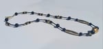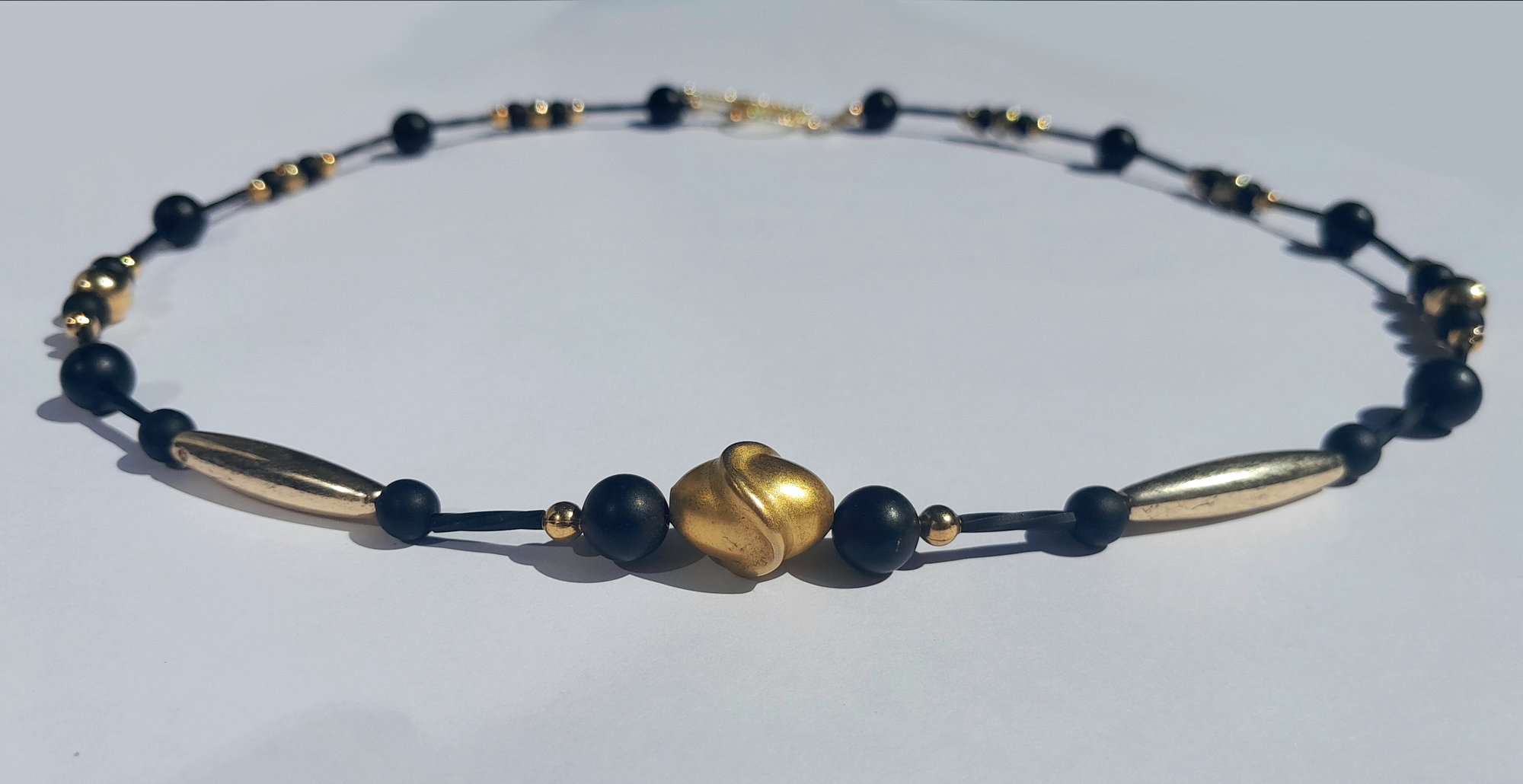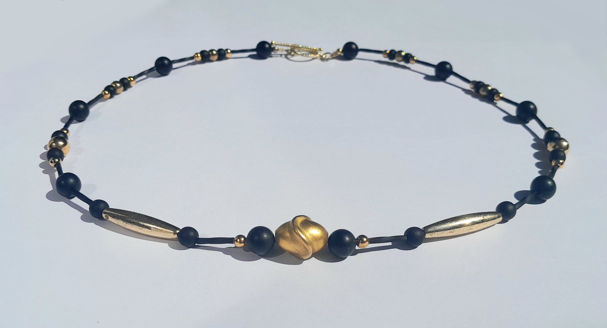 22" necklace with matte black glass and stone and vintage metallic beads with a silver-coloured metal hook clasp.