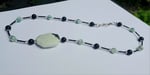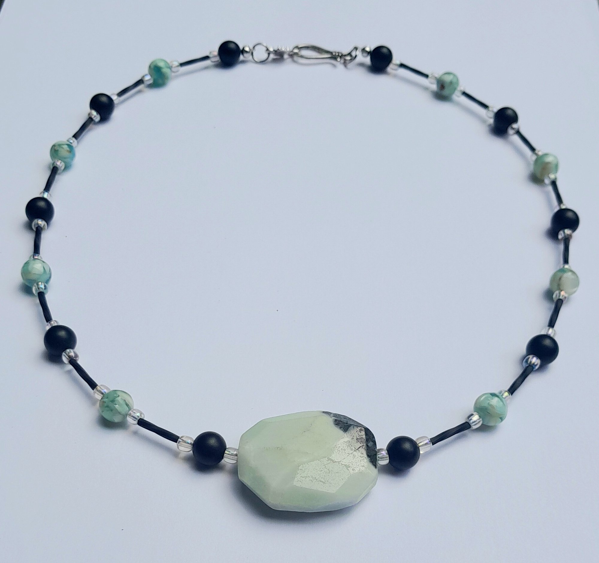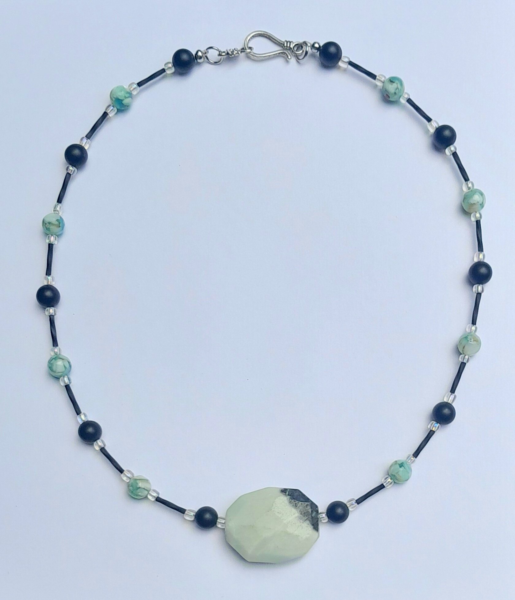 21" necklace with matte black glass and stone beads, multicolored glass and an natural stone pendant with a silver-coloured metal hook clasp.
