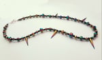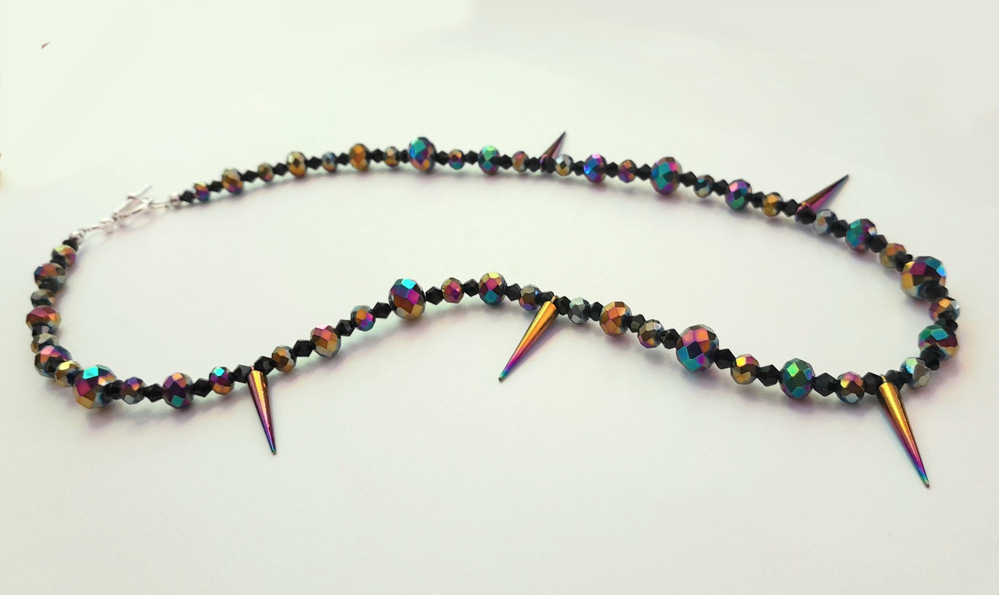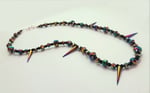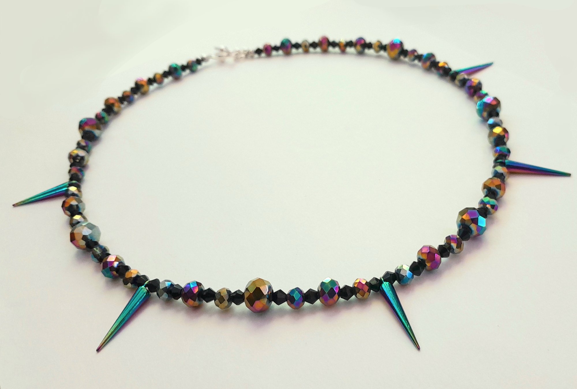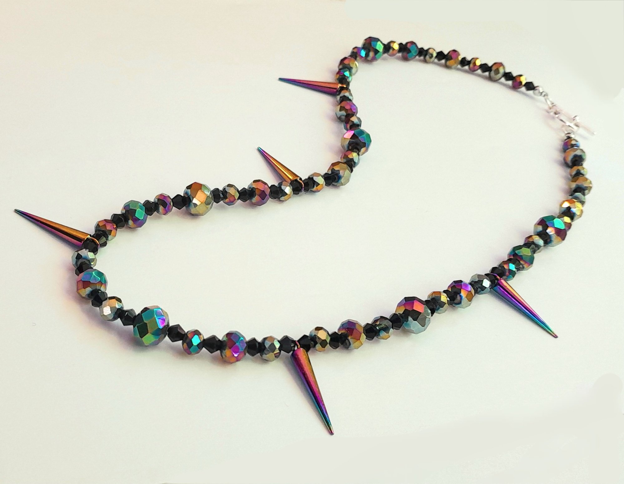 22" necklace with oil slick ab faceted glass beads, rainbow metal spikes and a silver-coloured toggle clasp.