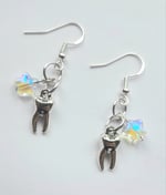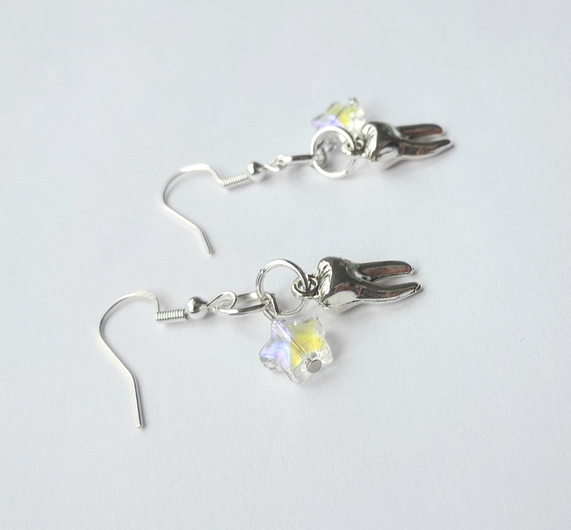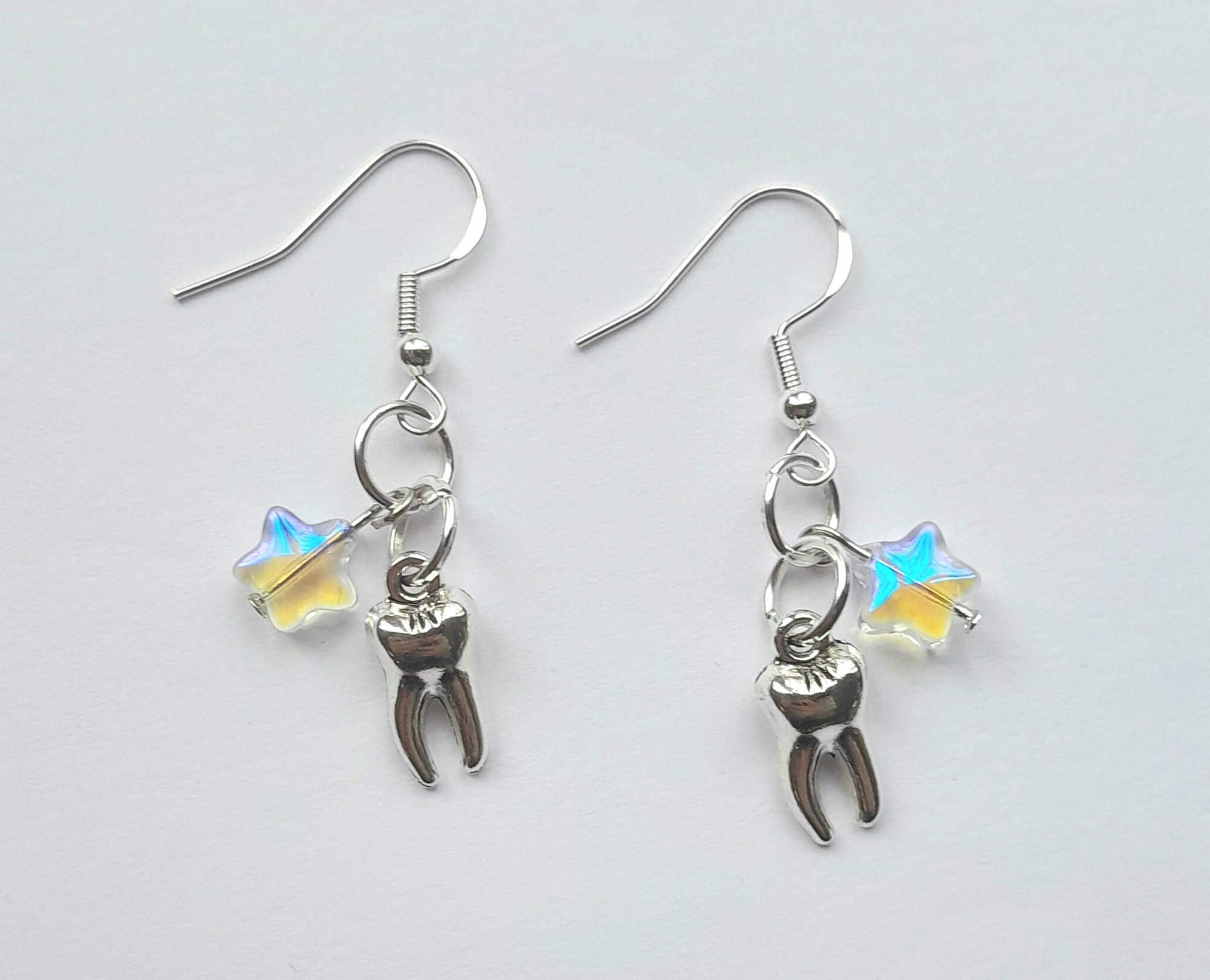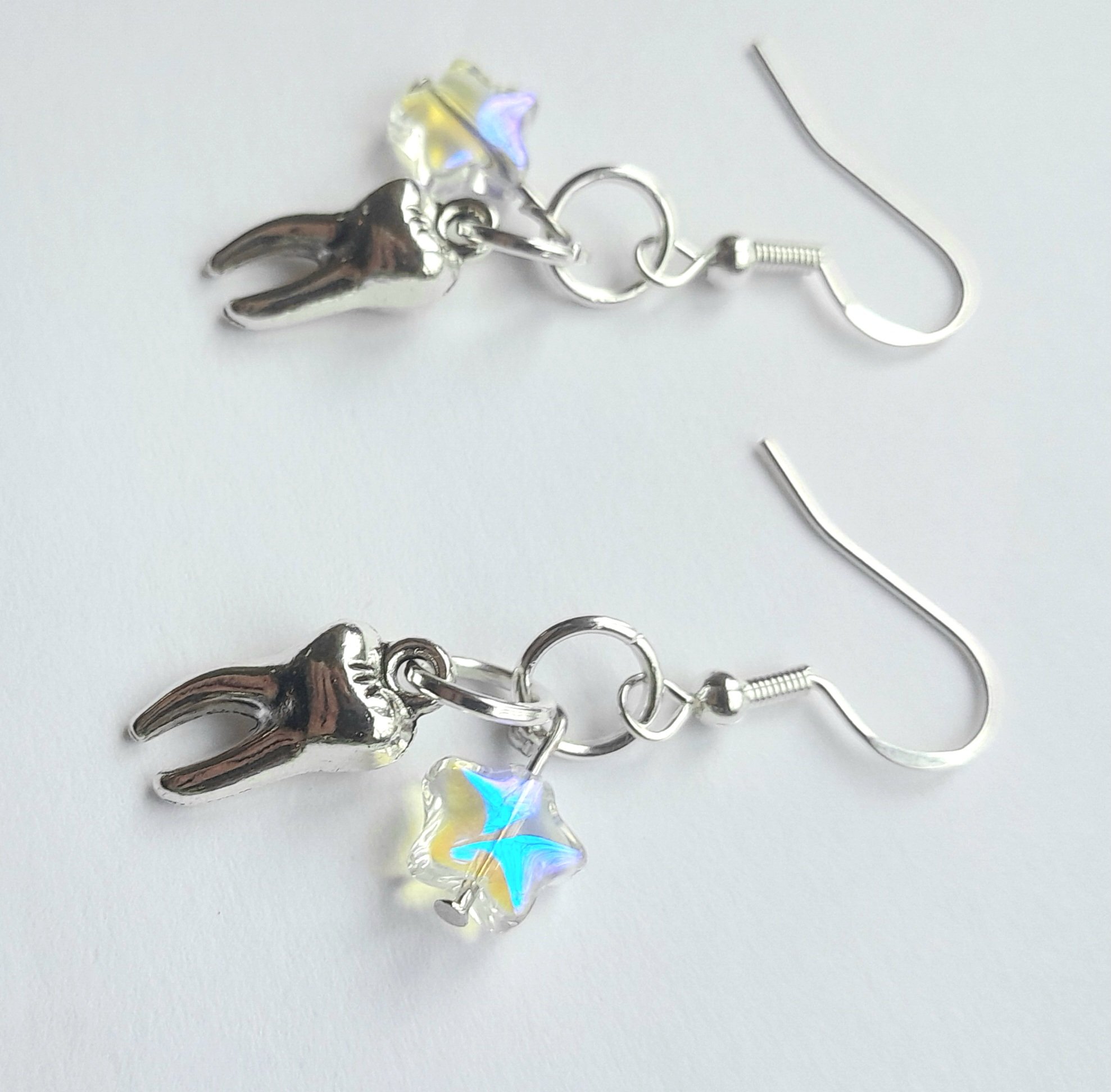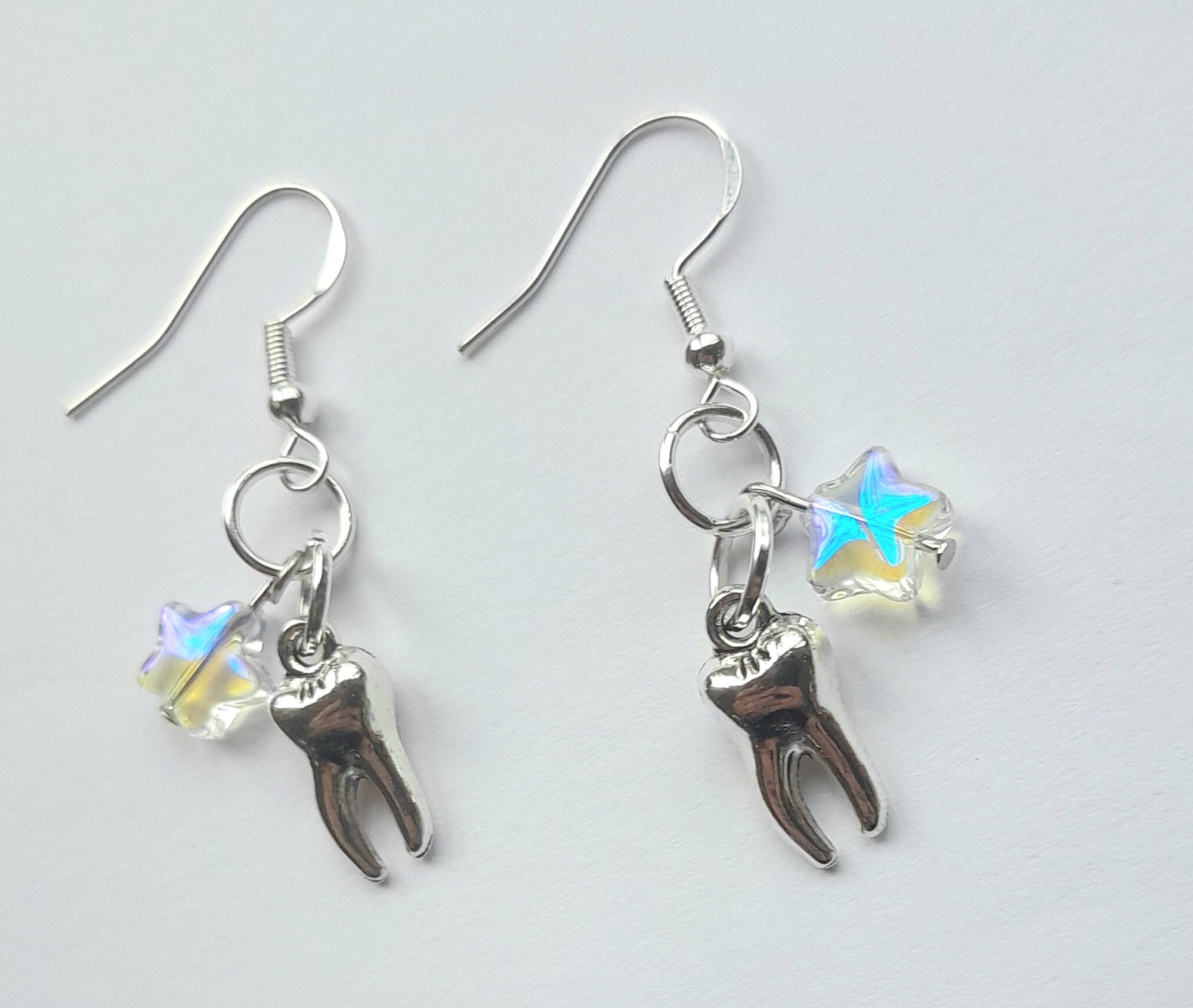 Pair of handmade earrings with iridescent glass star and metal tooth charms, jump rings and hooks.