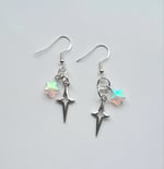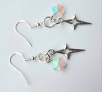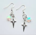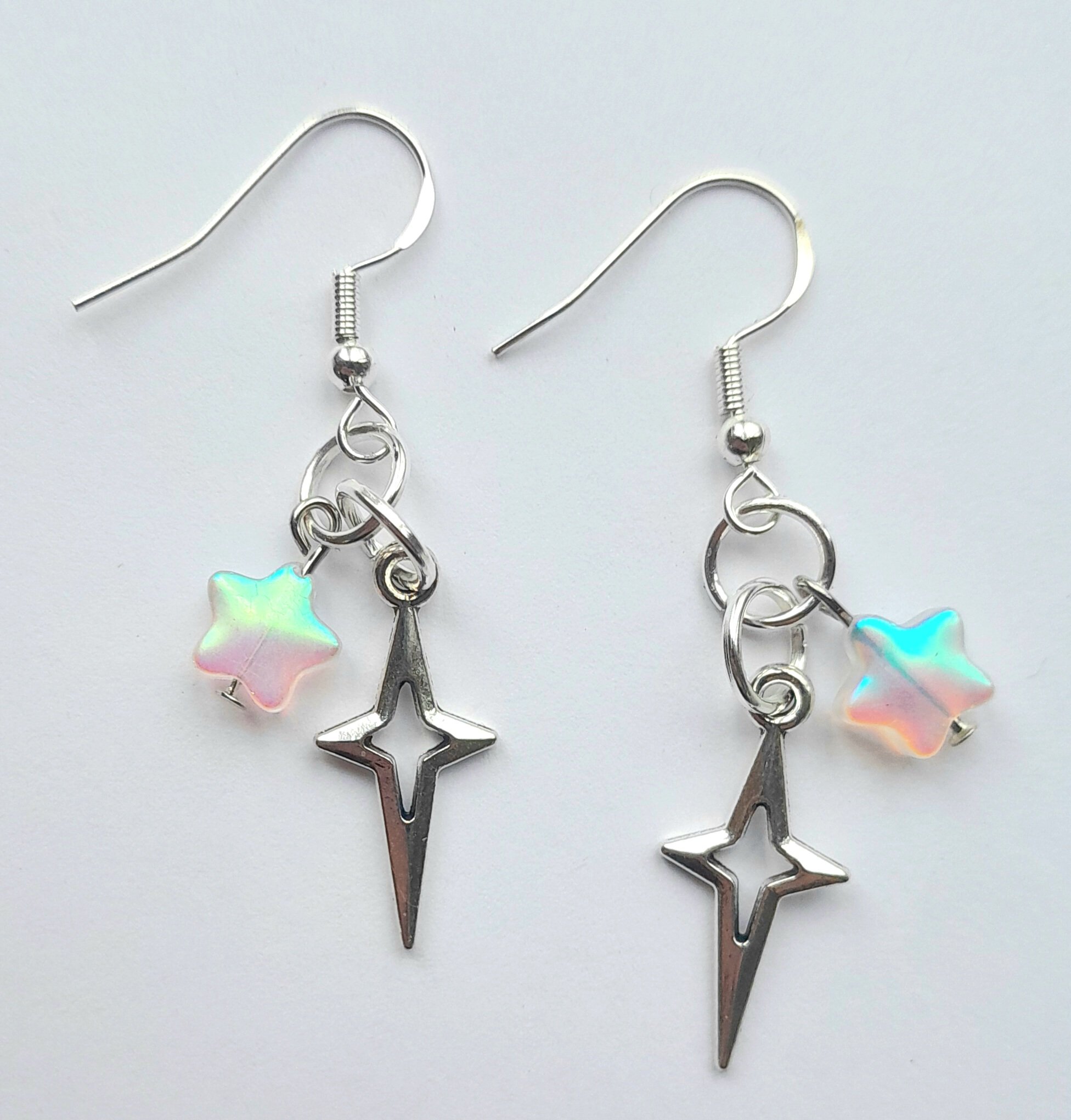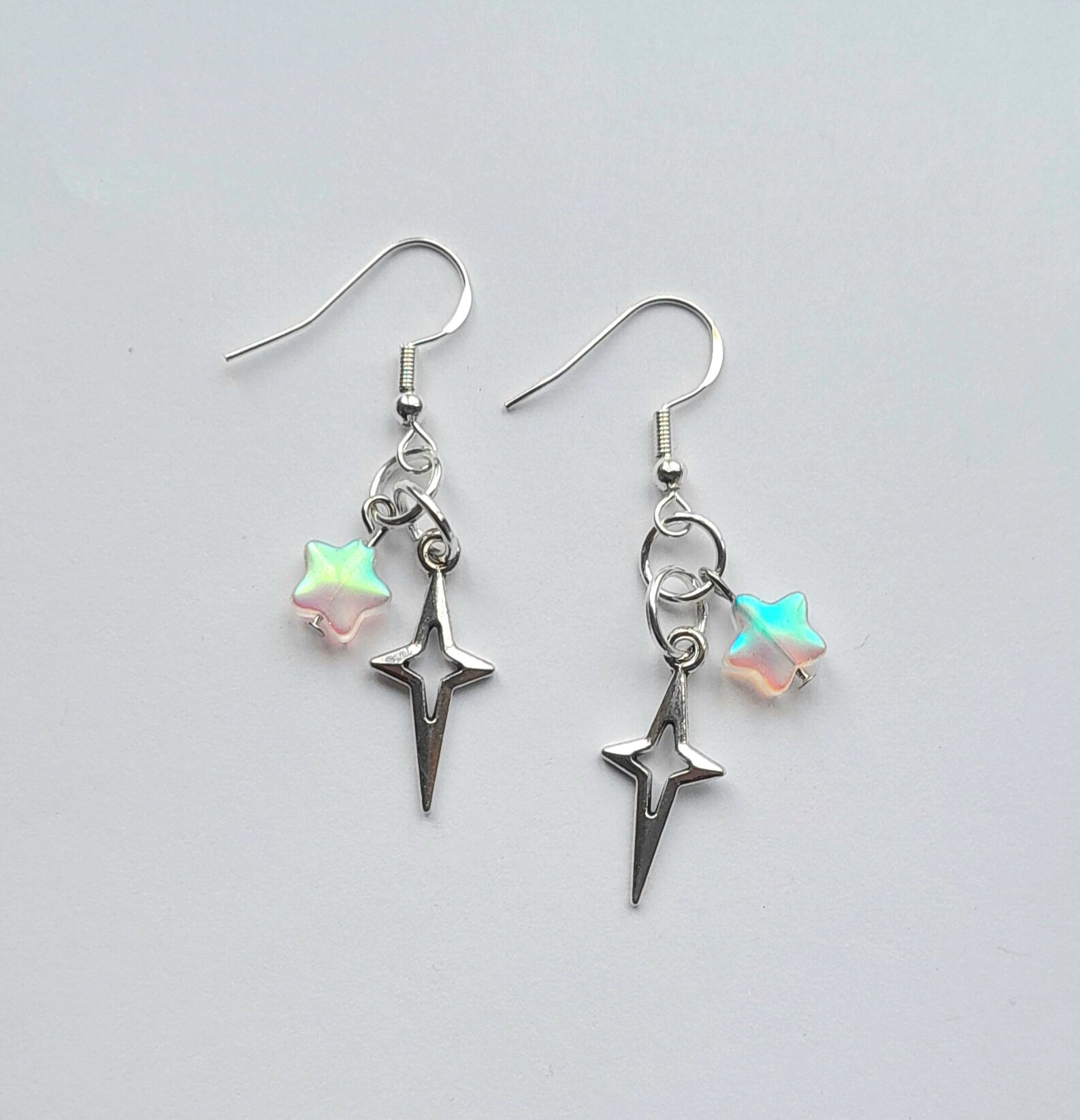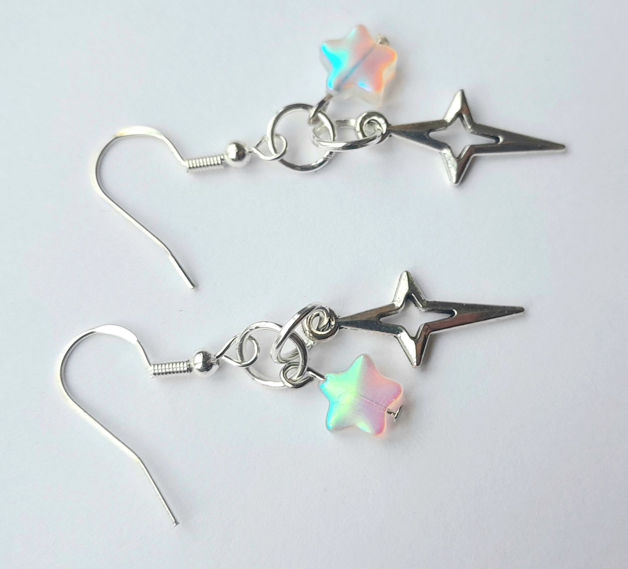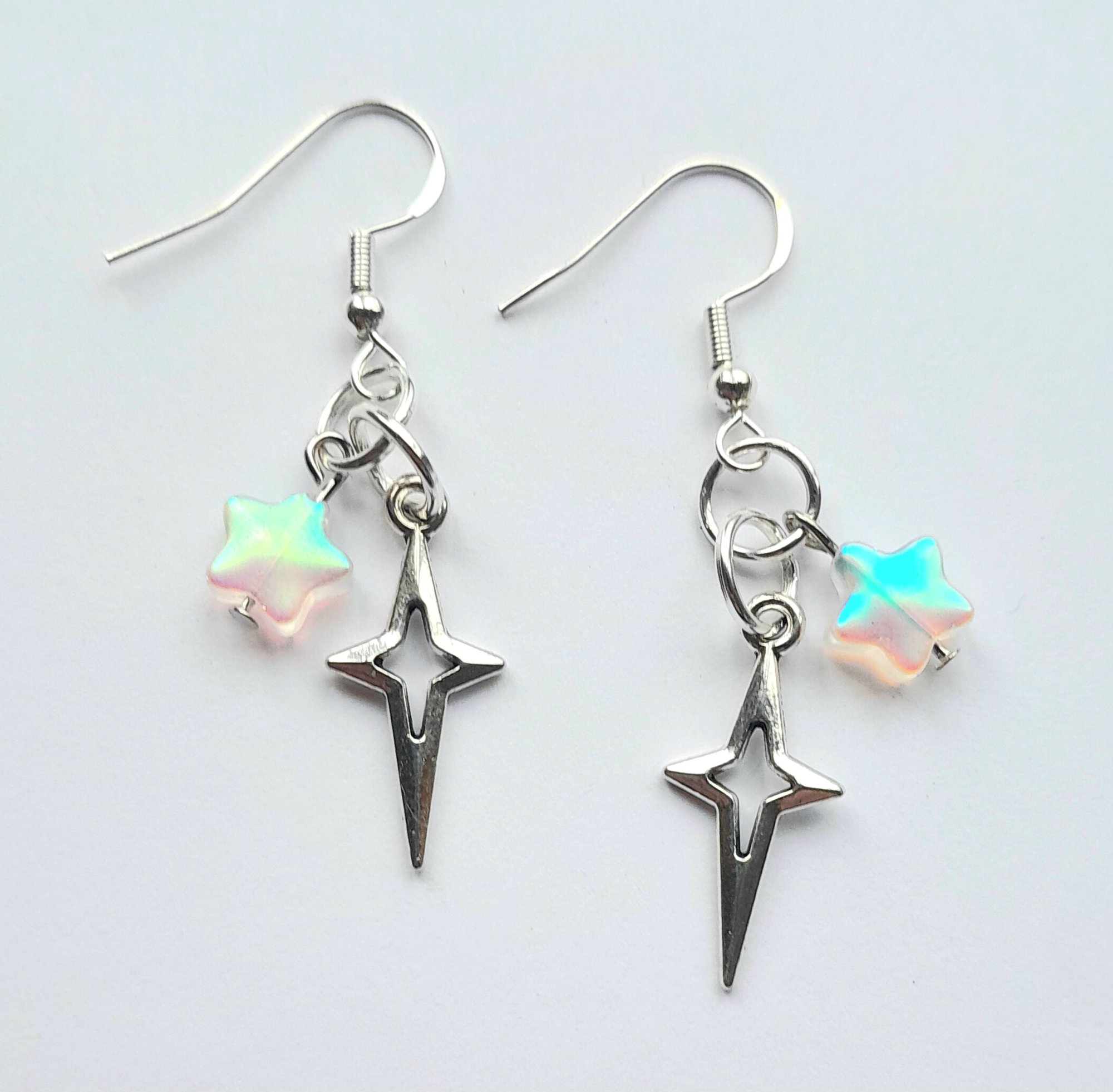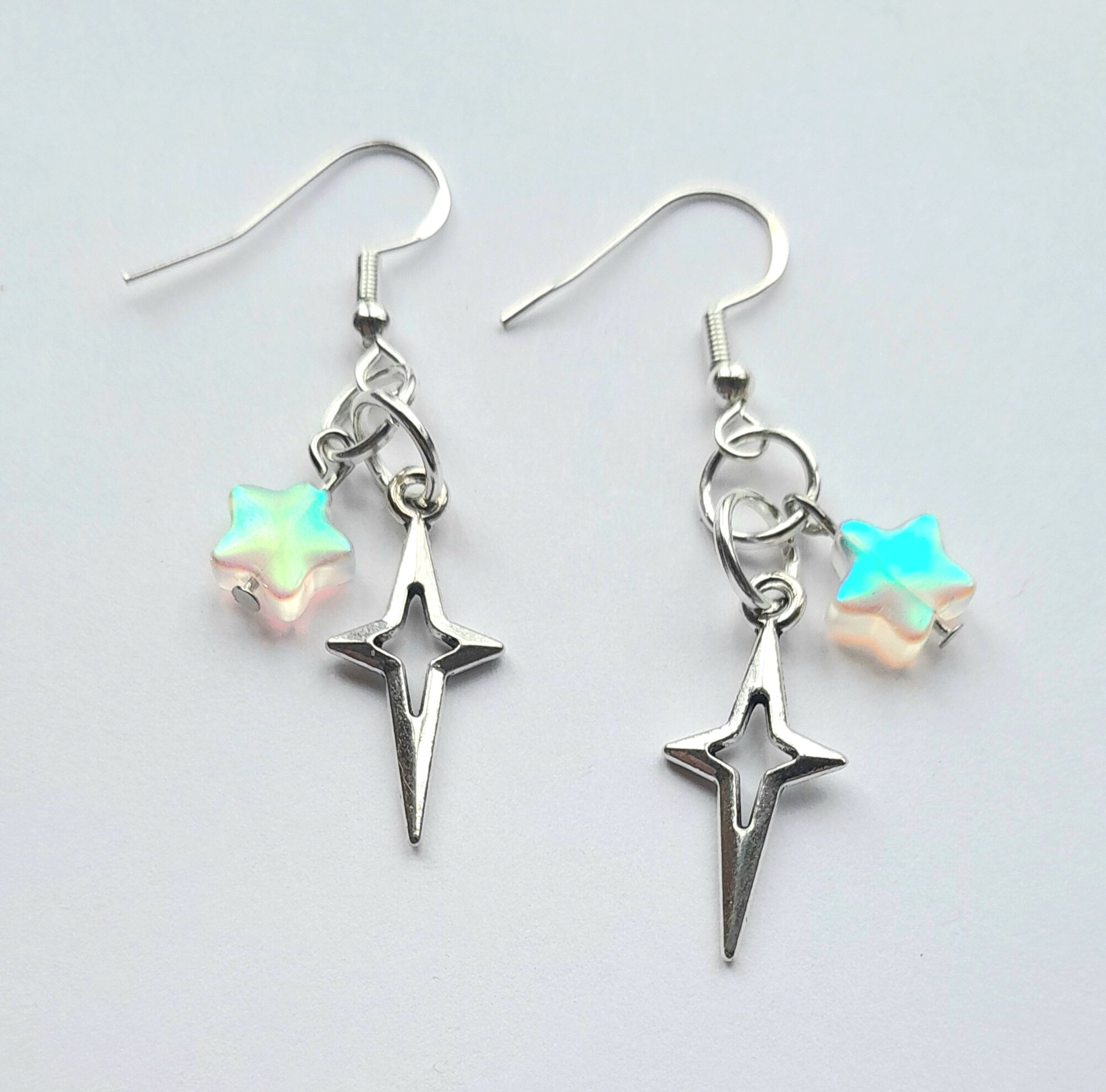 Pair of handmade earrings with iridescent glass stars, stainless steel star charms, jump rings and sterling silver plated hooks.