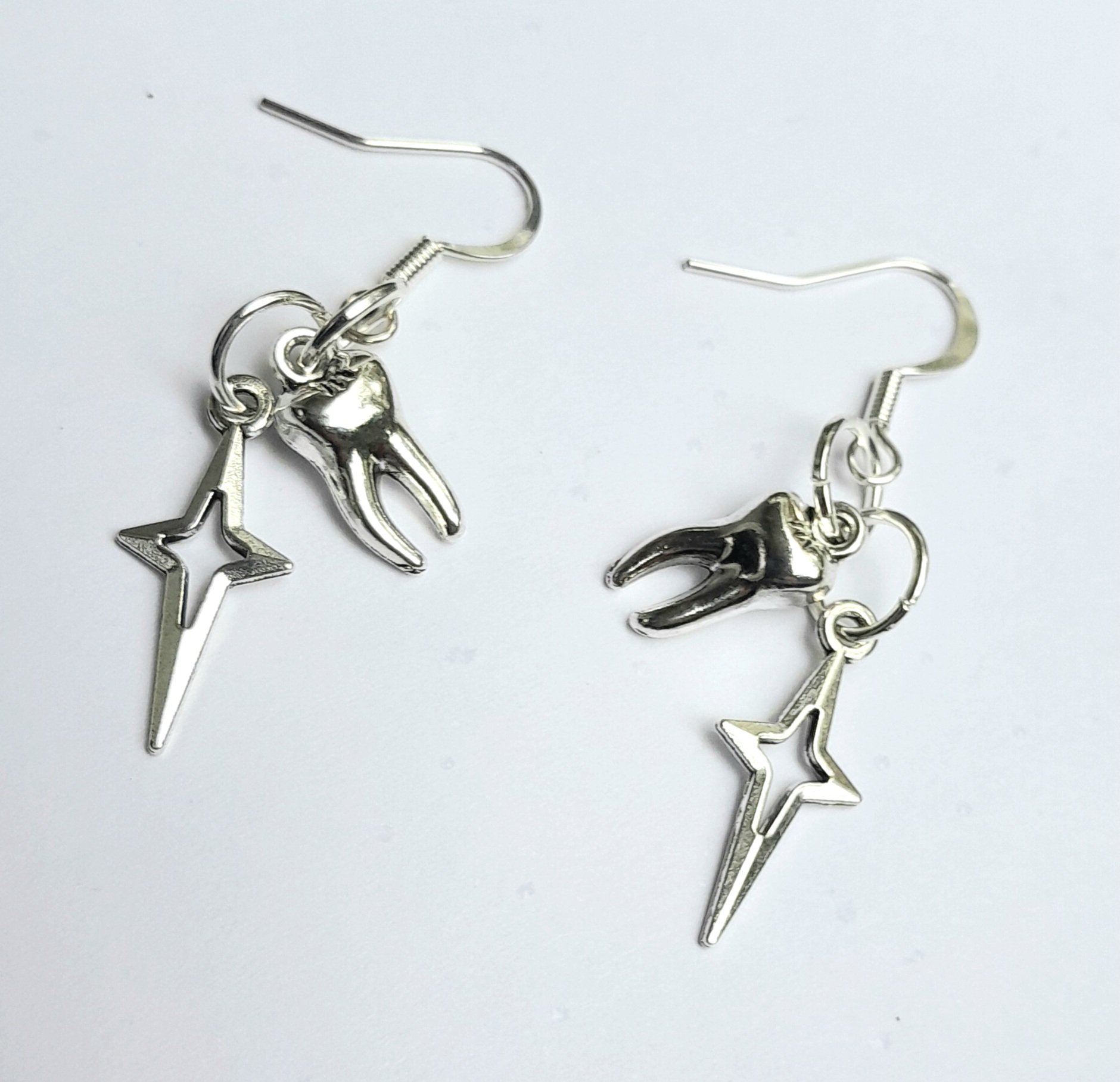 Pair of handmade earrings with stainless steel star and tooth charms, jump rings and hooks.