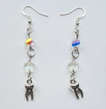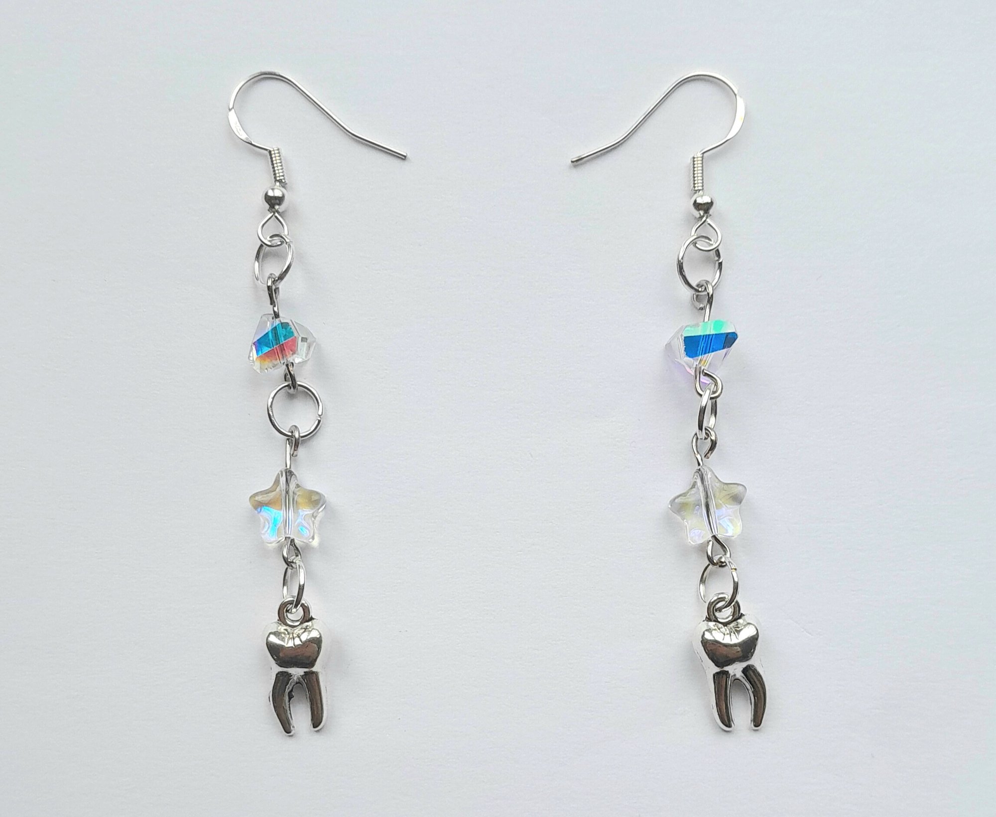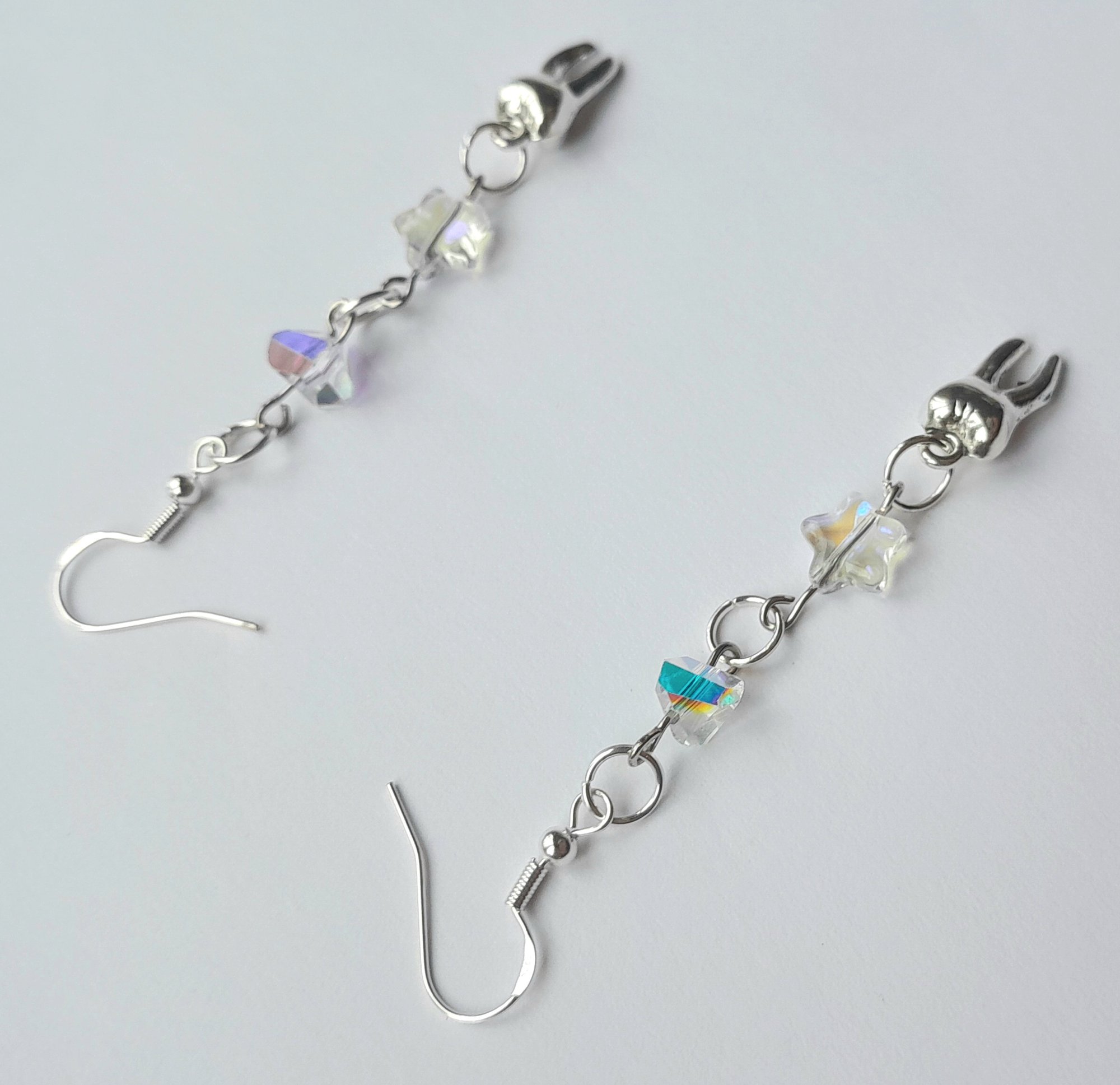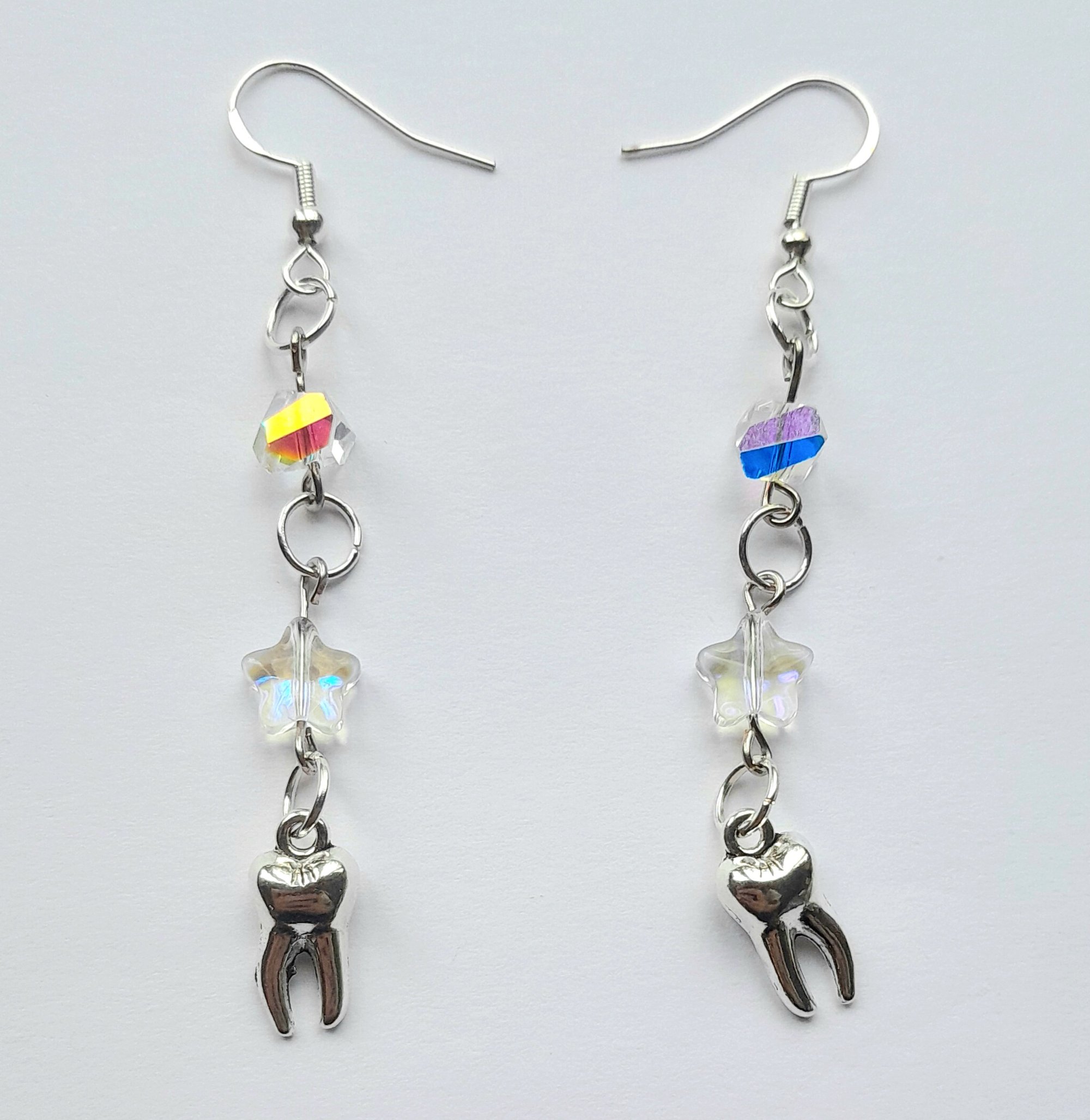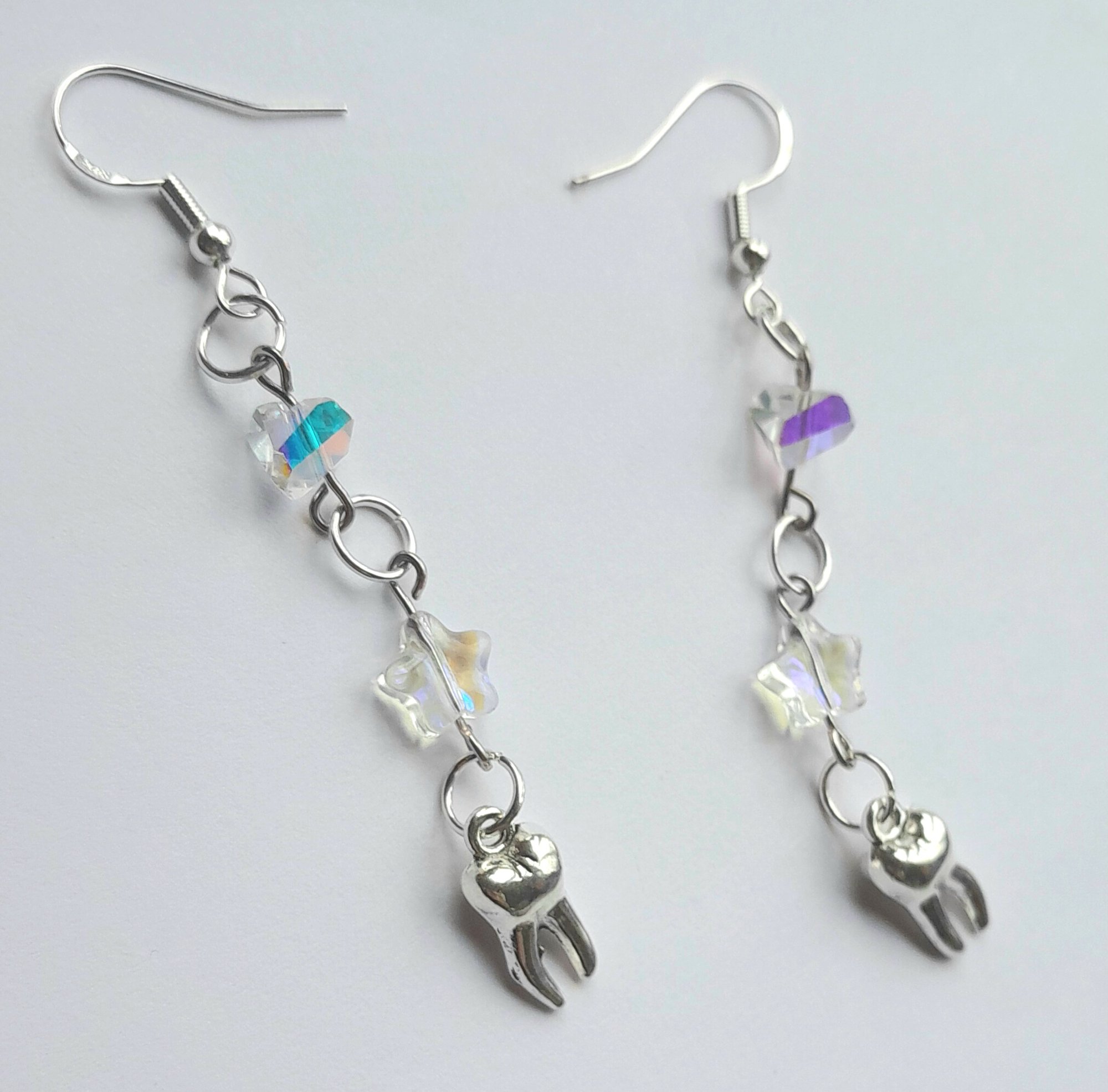 Pair of handmade earrings with iridescent glass beads and stars, metal teeth, jump rings and hypoallergenic hooks.