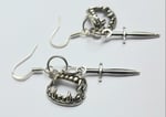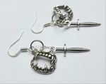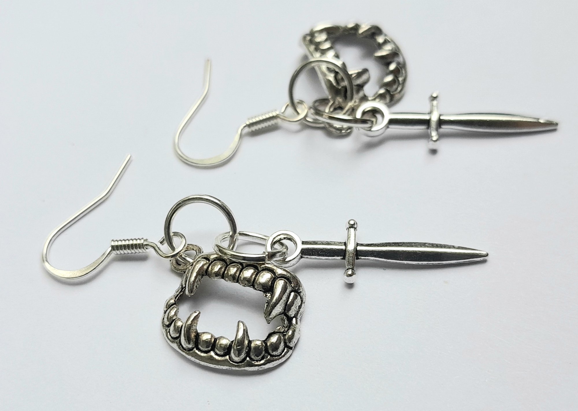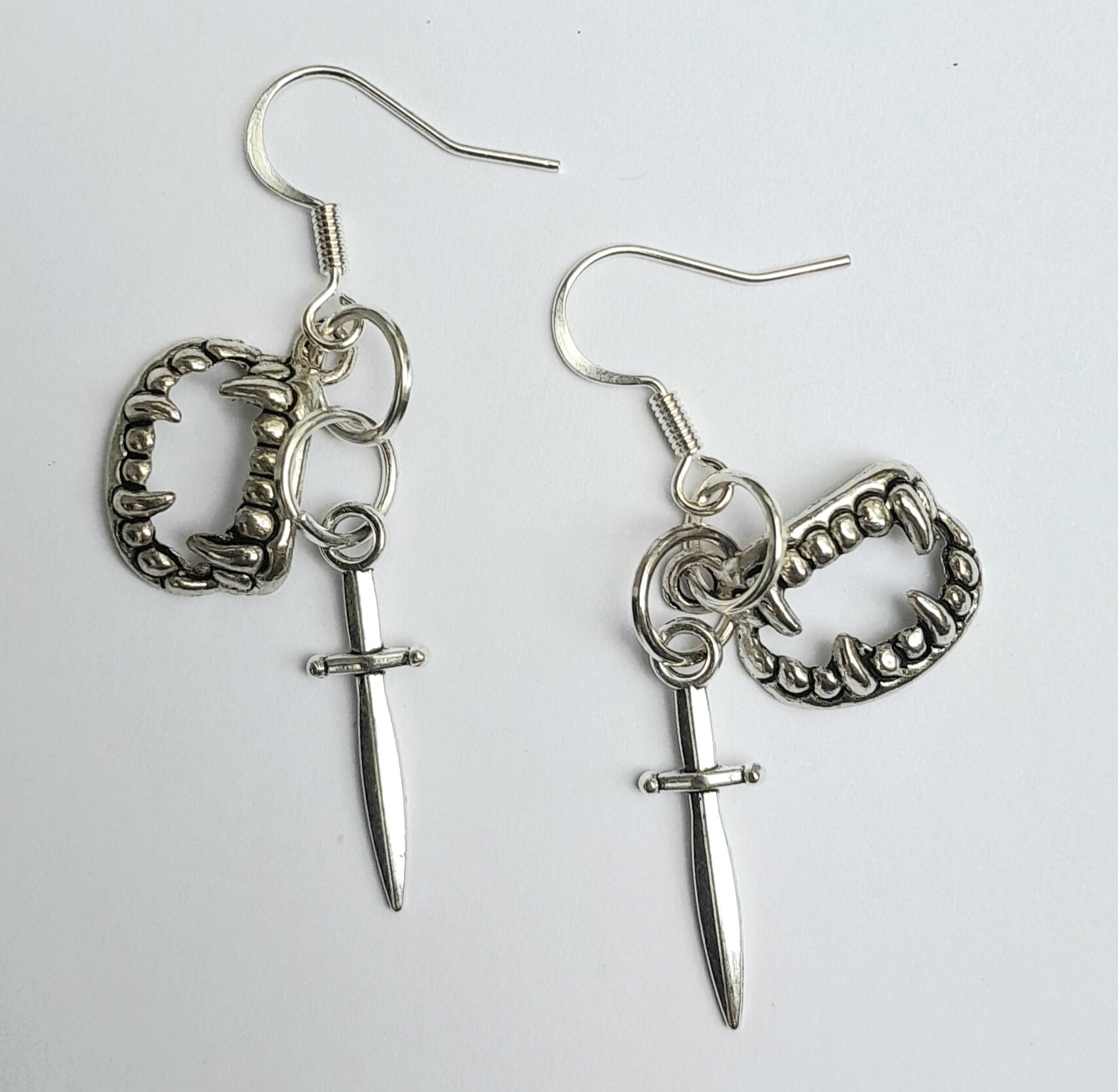 Pair of handmade earrings with stainless steel dagger and fang charms, jump rings and hooks.