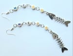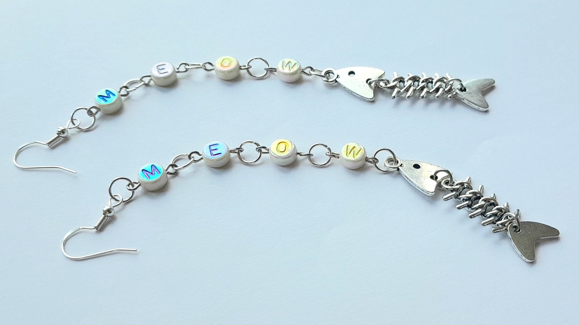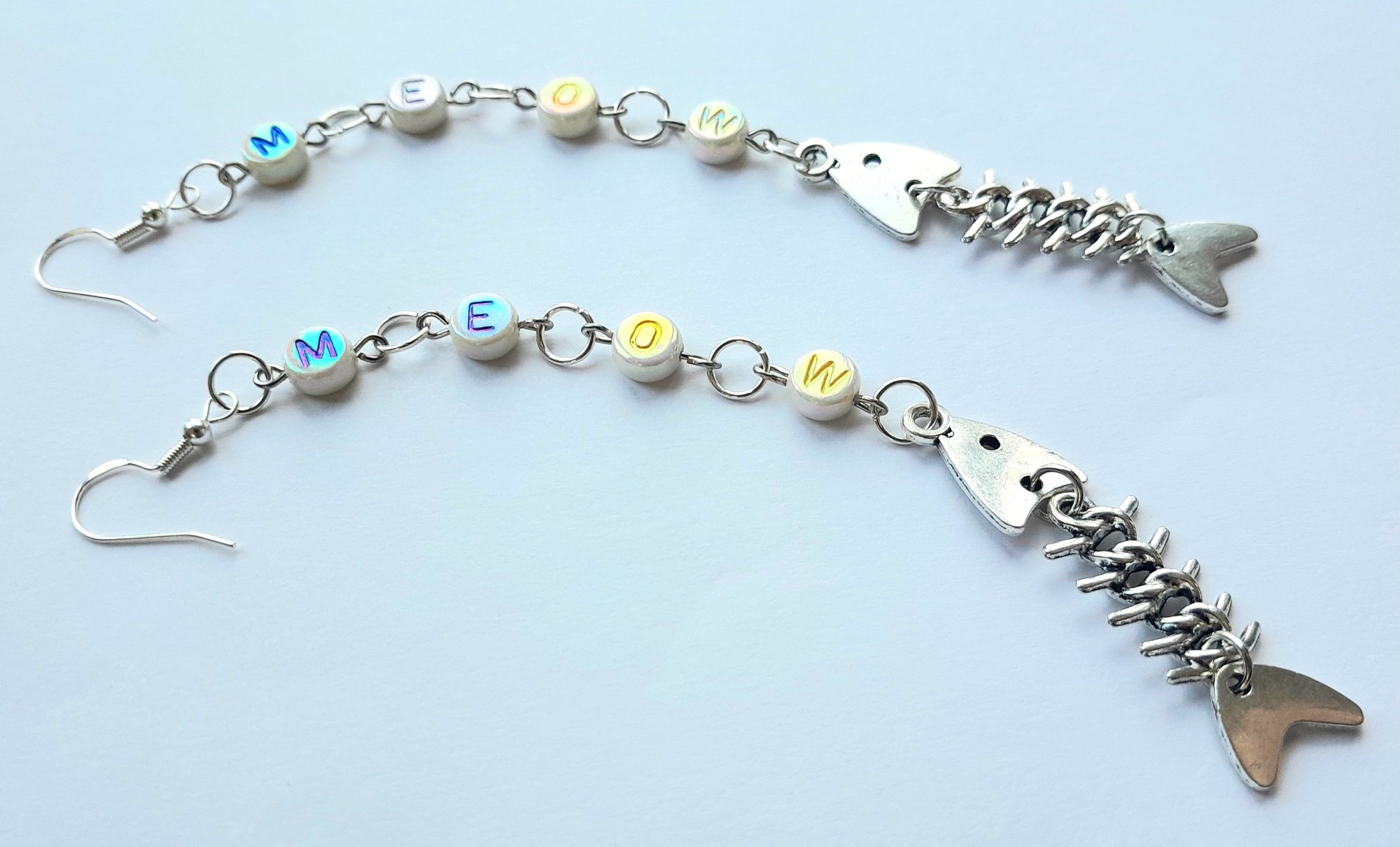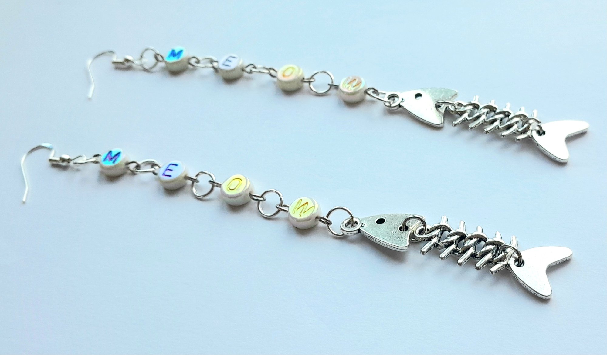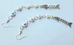 Pair of handmade earrings with pearlescent plastic letter beads and a metal fish skeleton charm, jump rings and hypoallergenic hooks.