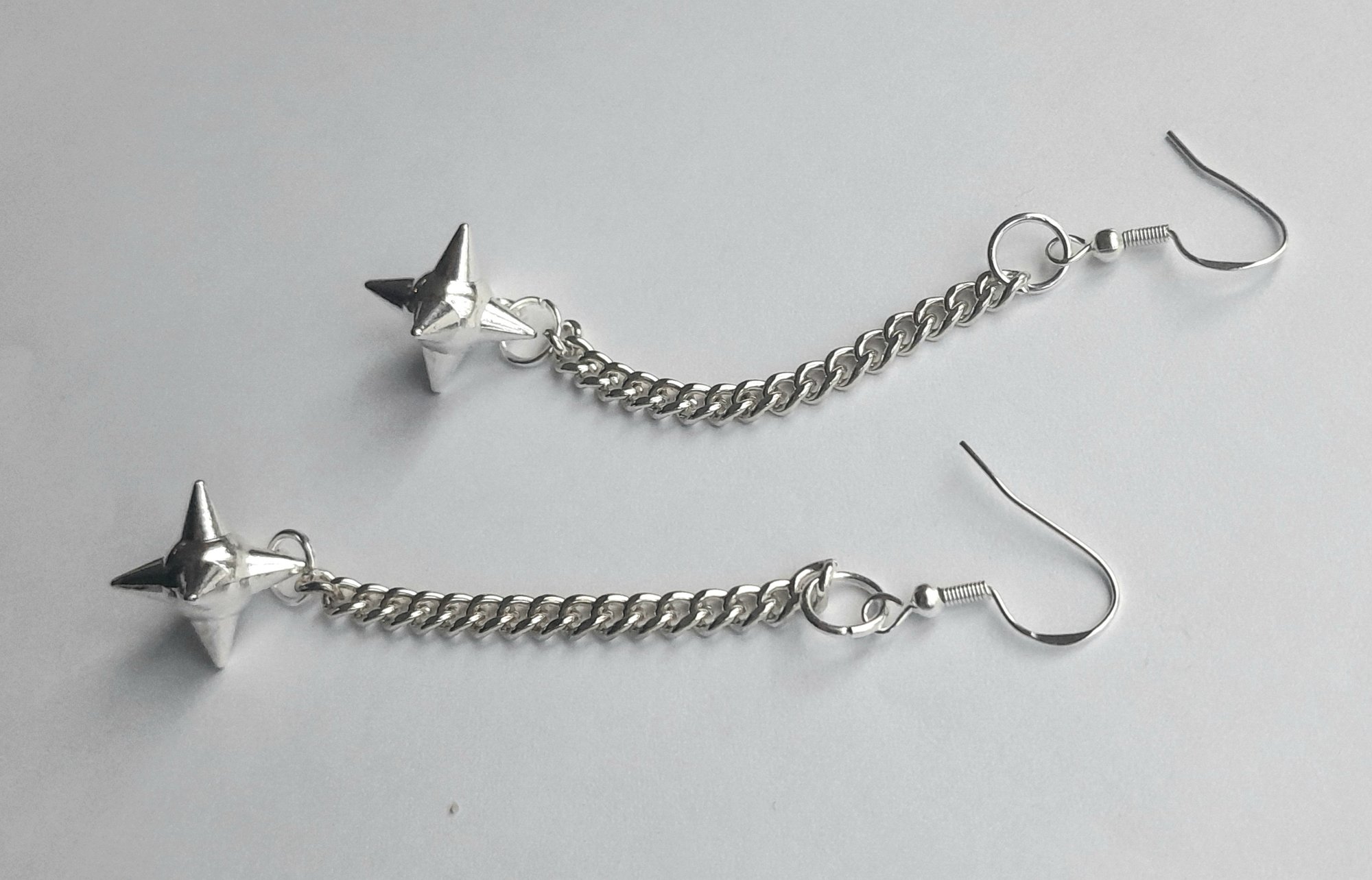 Pair of handmade earrings with stainless steel chain, spiked ball charms, jump rings and sterling silver plated hooks.