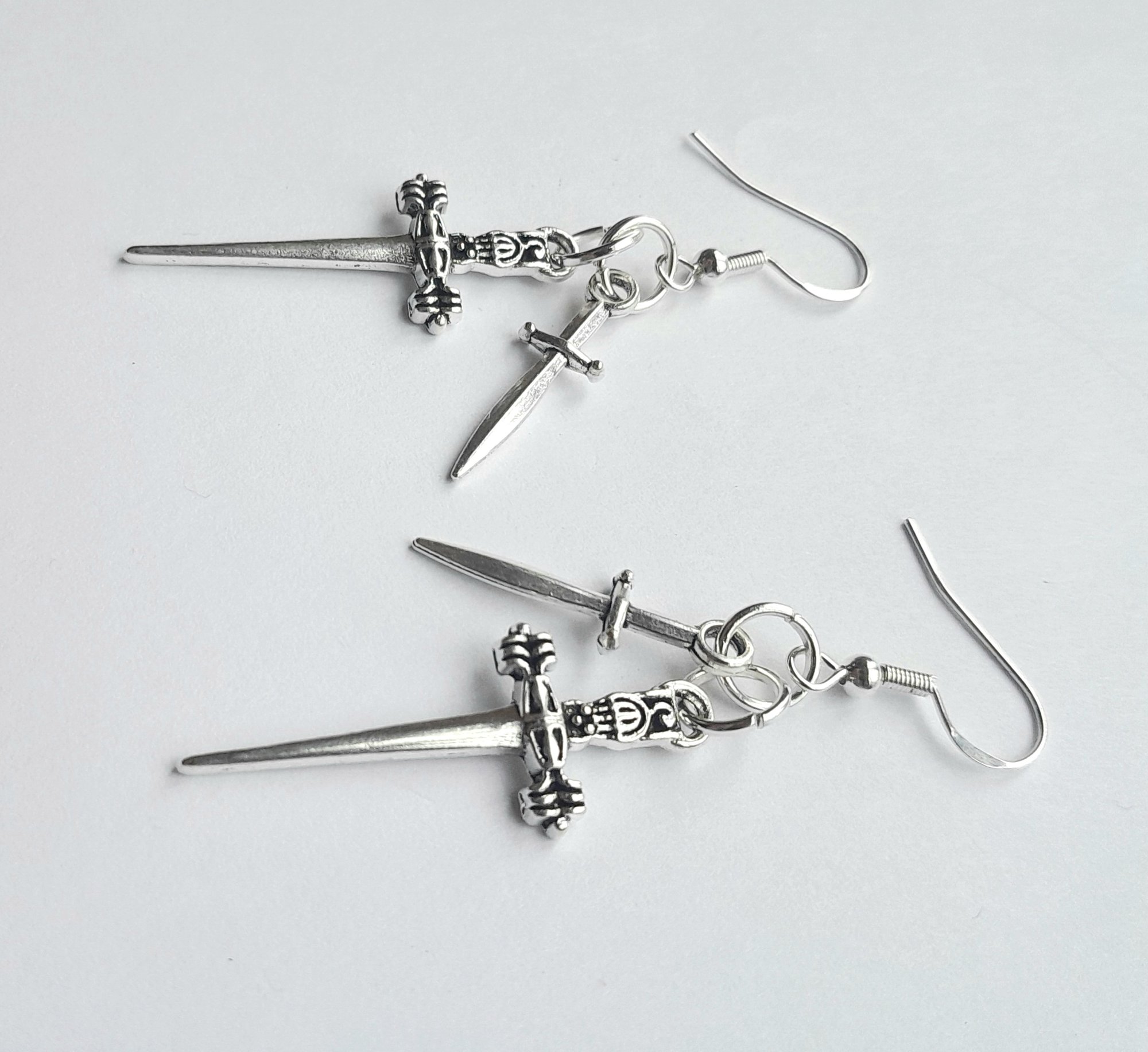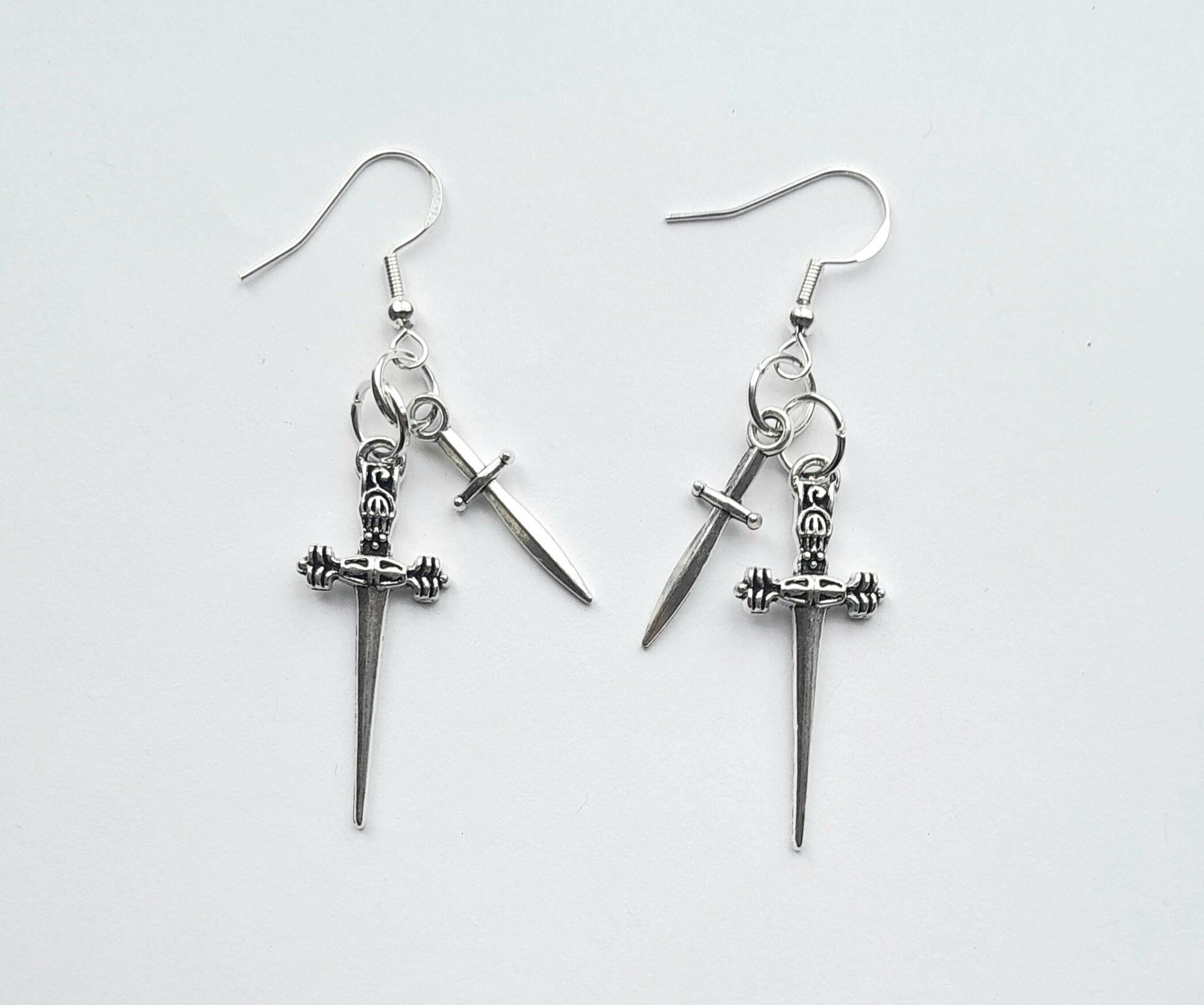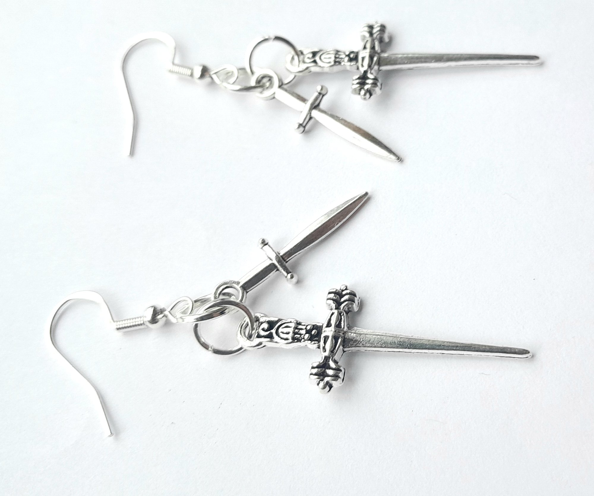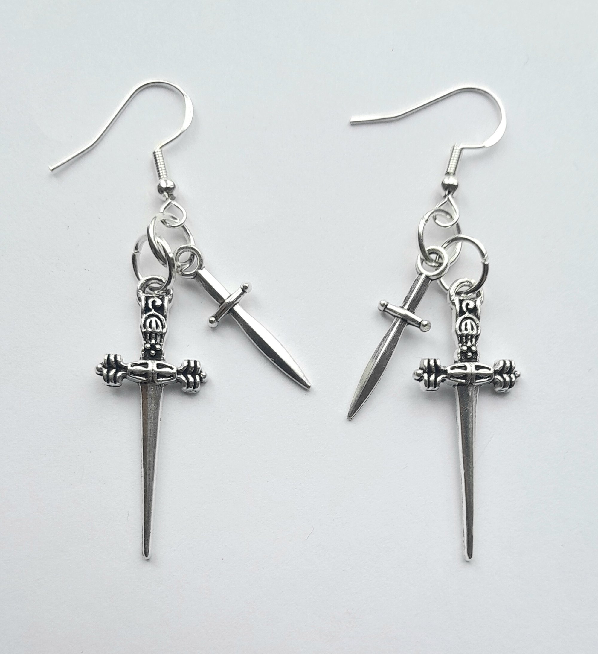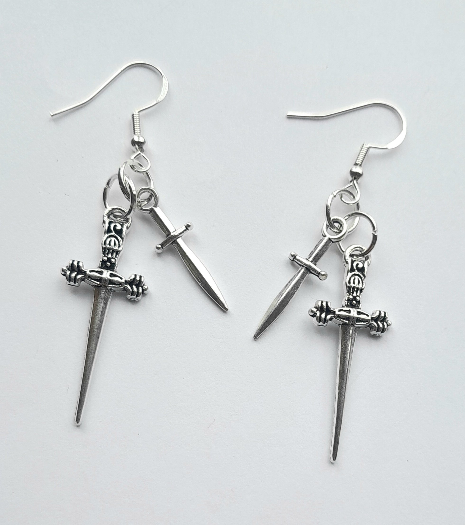 Pair of handmade earrings with stainless steel dagger charms, jump rings and hooks.