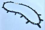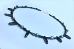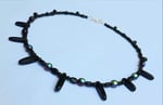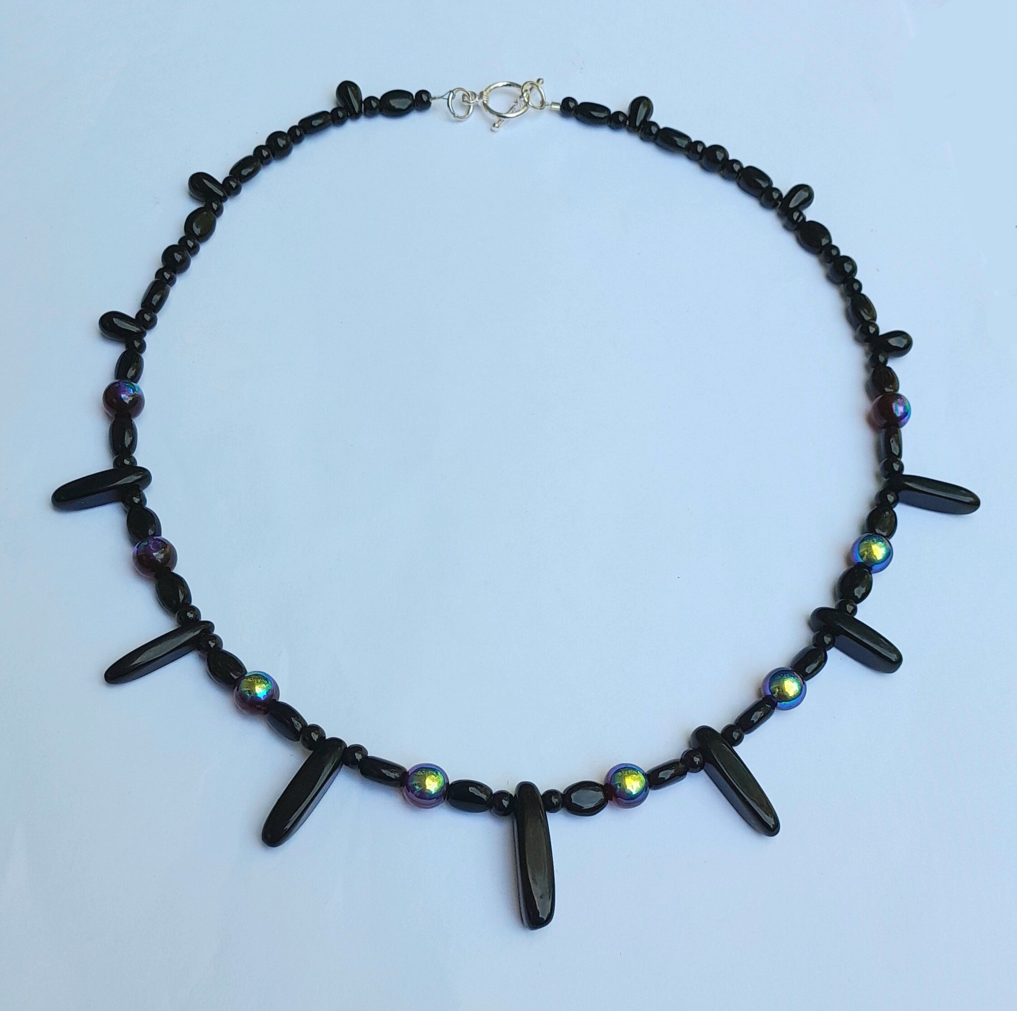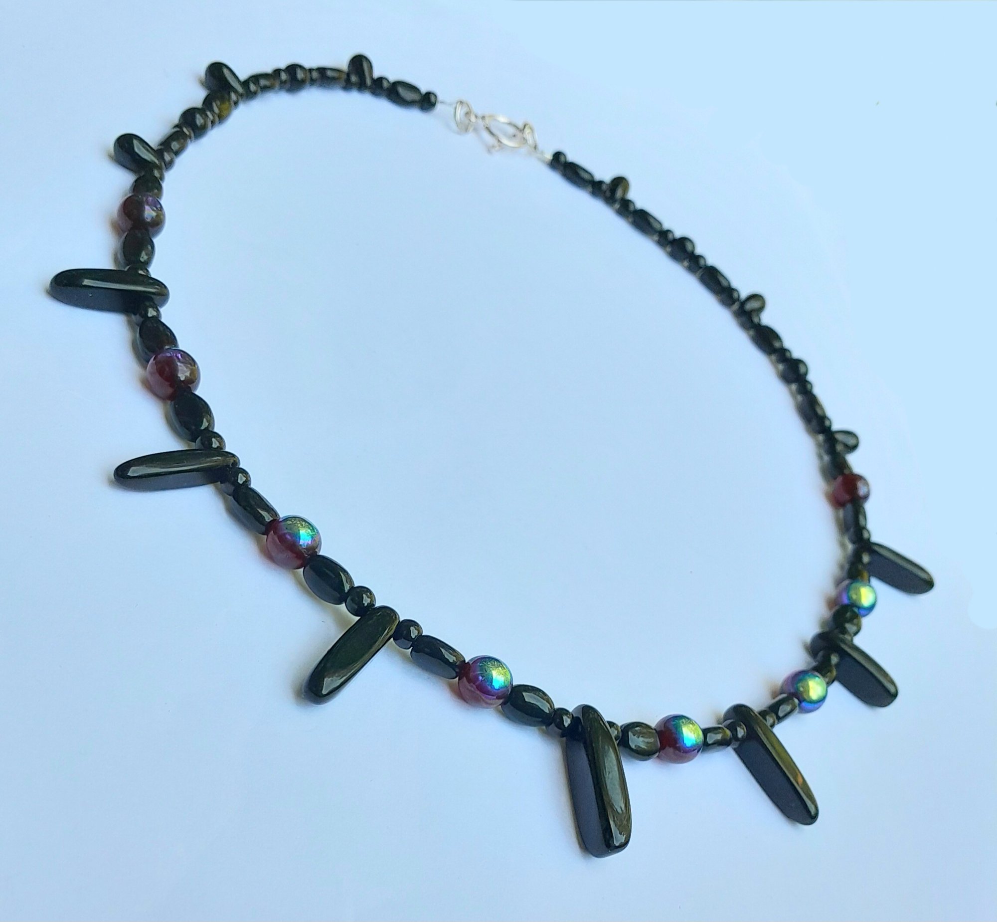 20" necklace with black and iridescent red glass and onyx spears and silver-coloured toggle clasp.