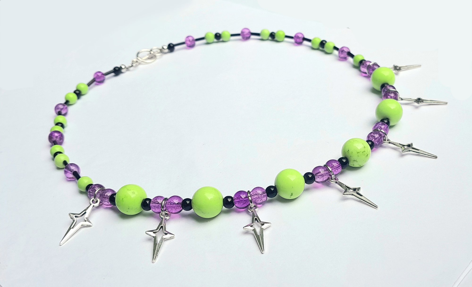 19" necklace with vintage glass beads and metal star pendants with a silver-coloured toggle clasp.