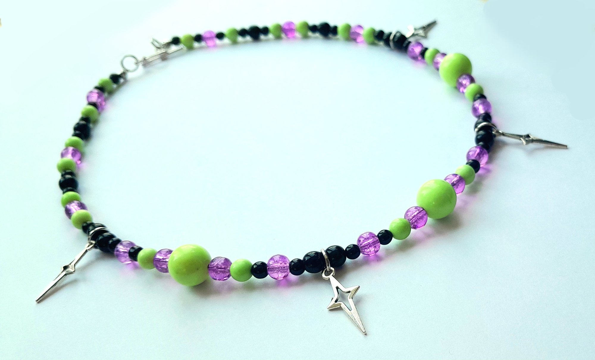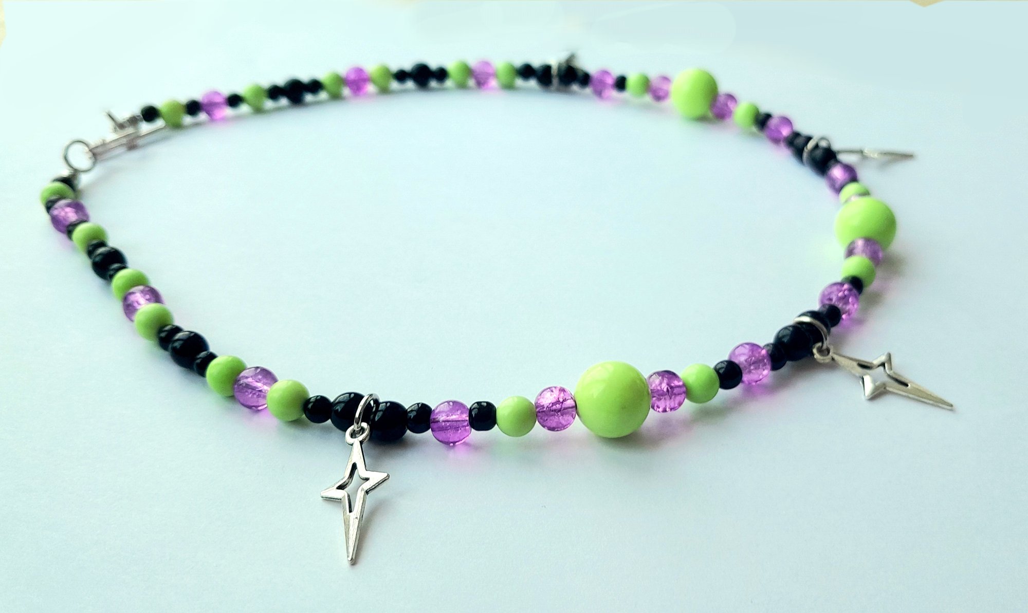 18" necklace with vintage glass beads, metal four-pointed stars and a silver-coloured metal toggle clasp.