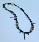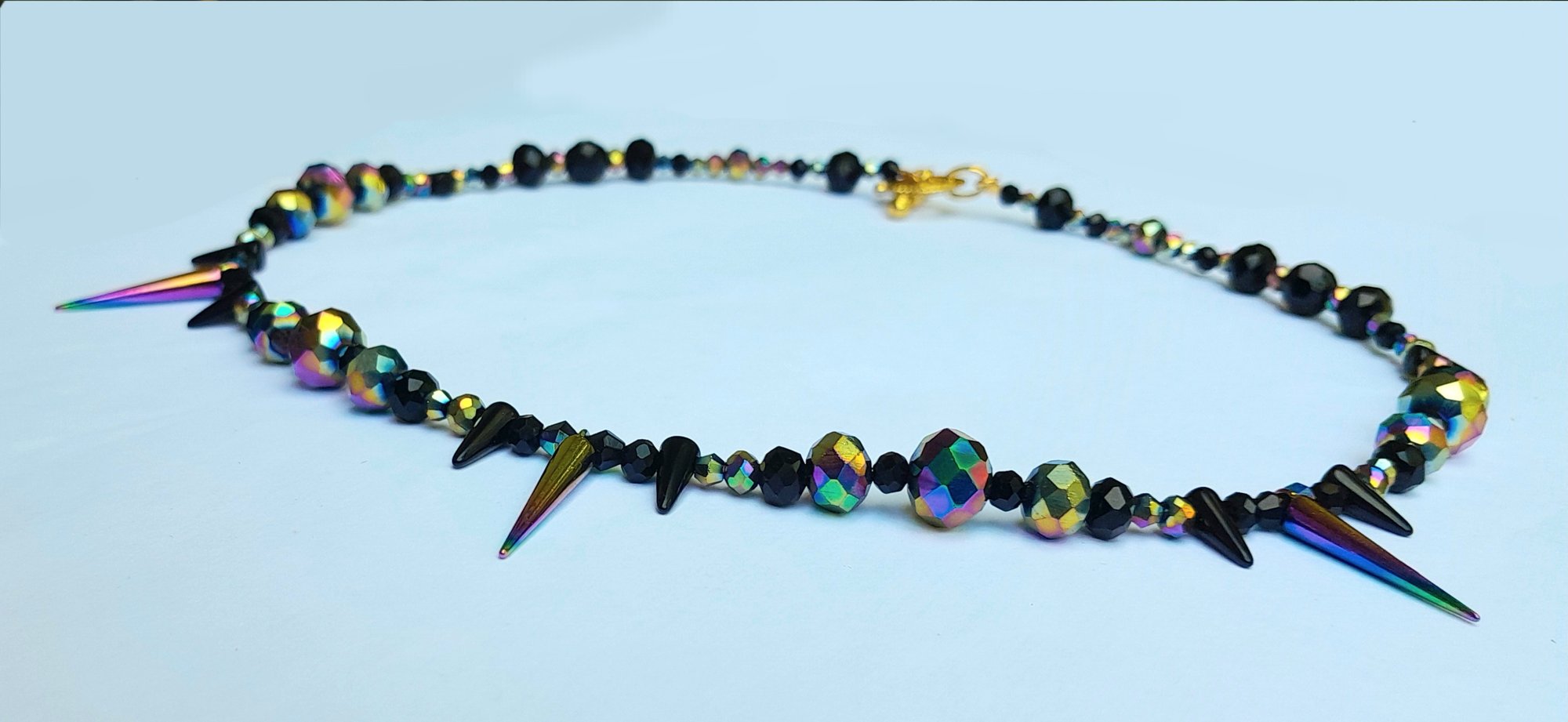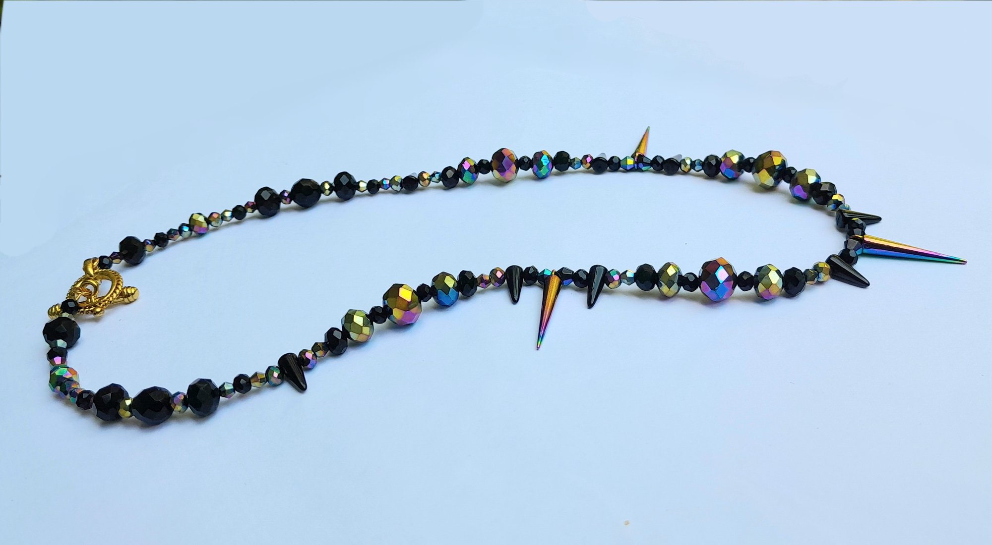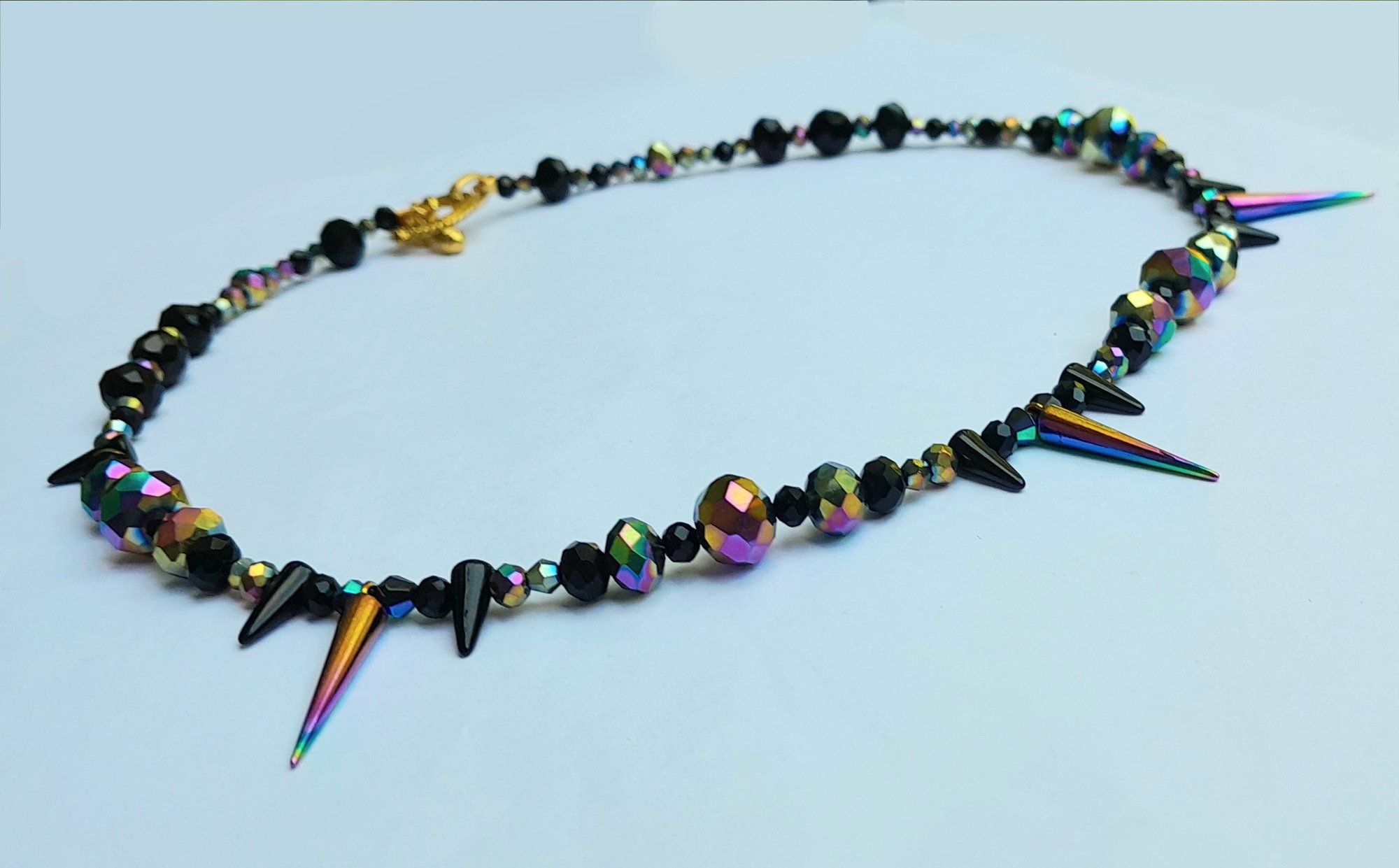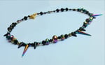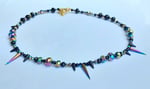 19" necklace with iridescent and black glass beads and black glass and rainbow metal spikes and a gold-coloured toggle clasp.
