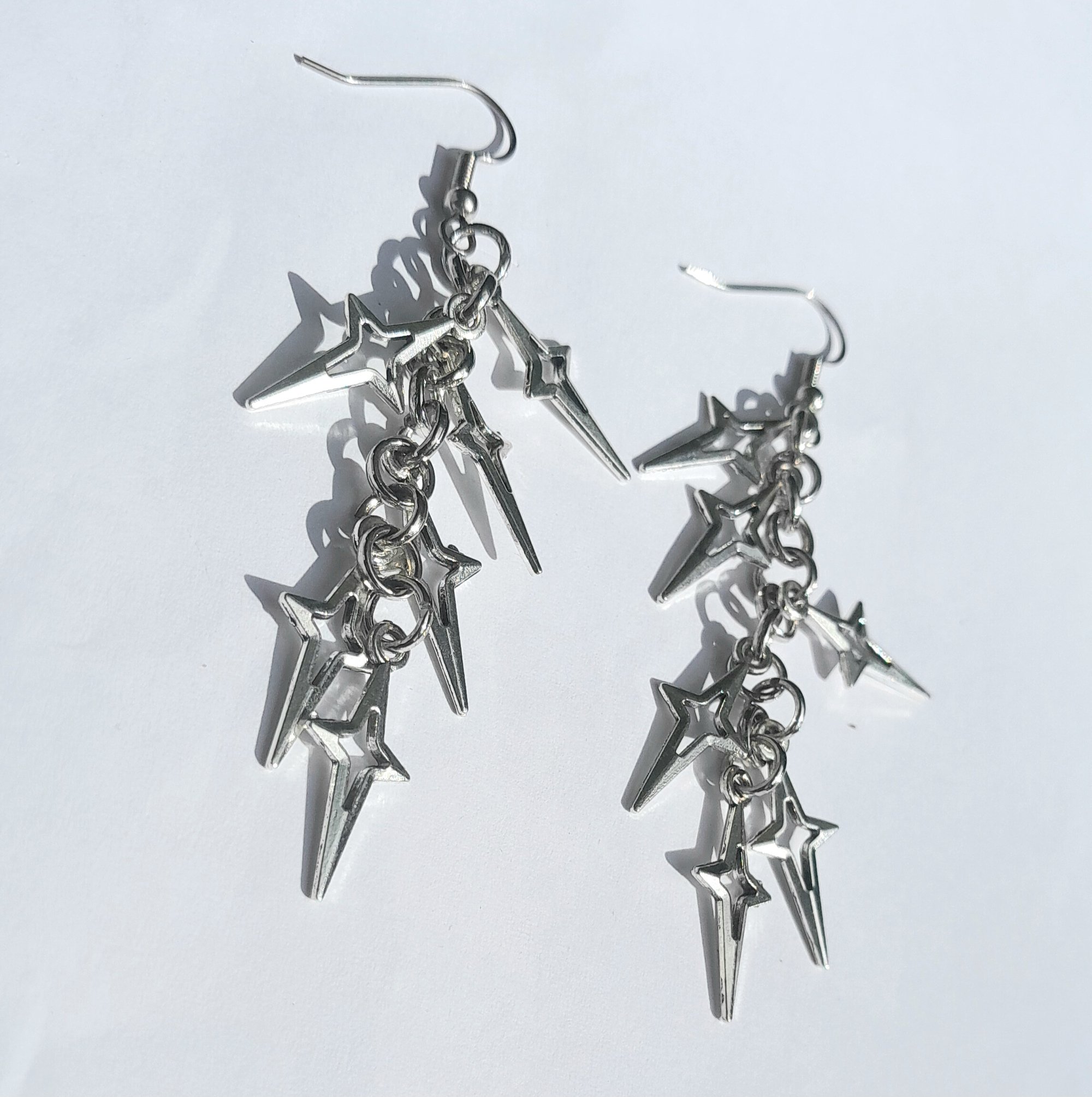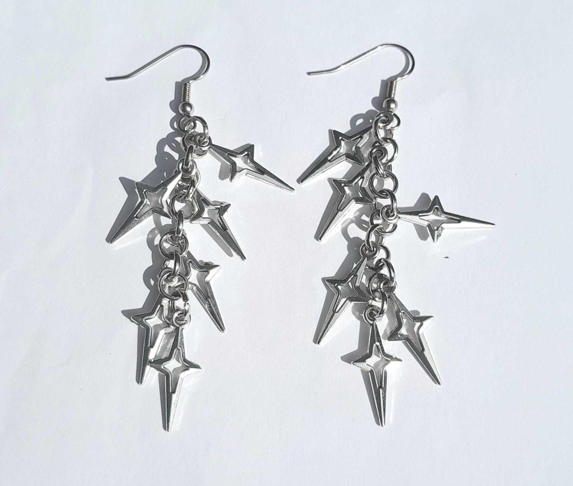 Pair of handmade earrings with 6 stainless steel stars, jump rings and hooks.