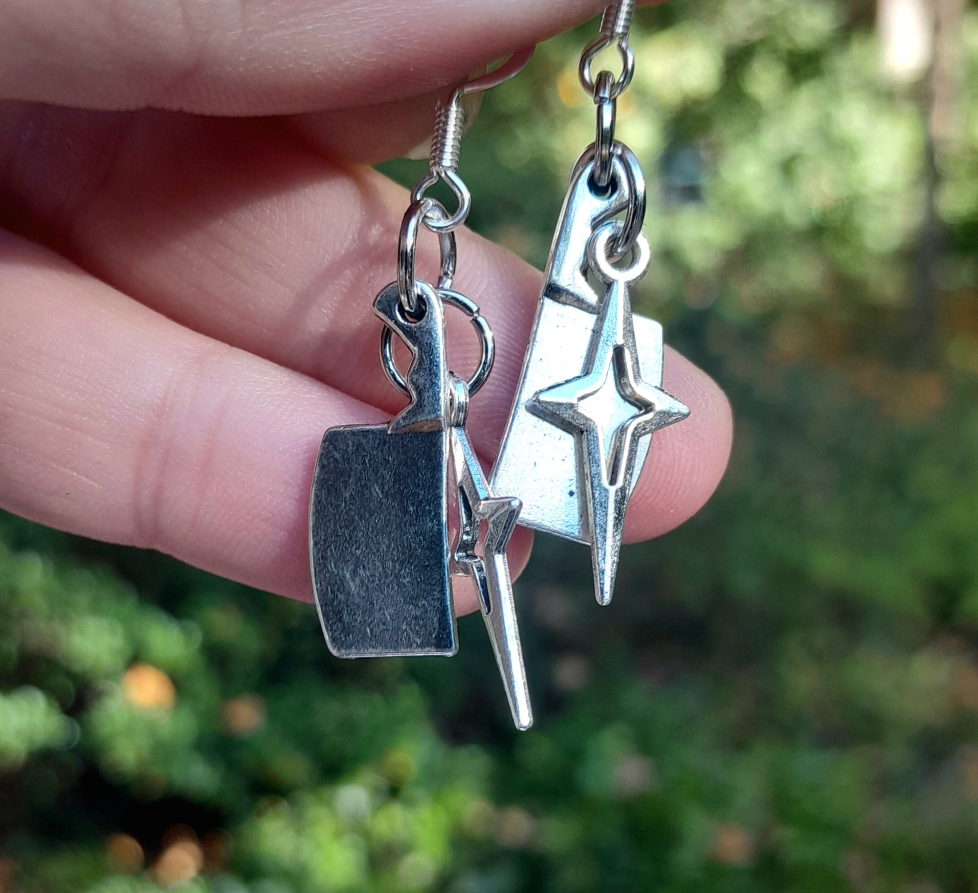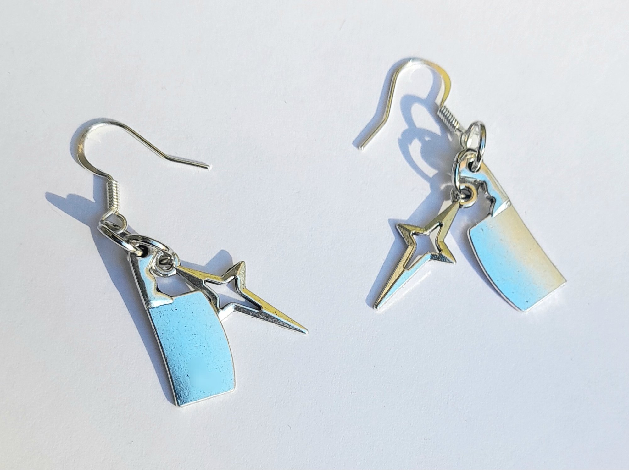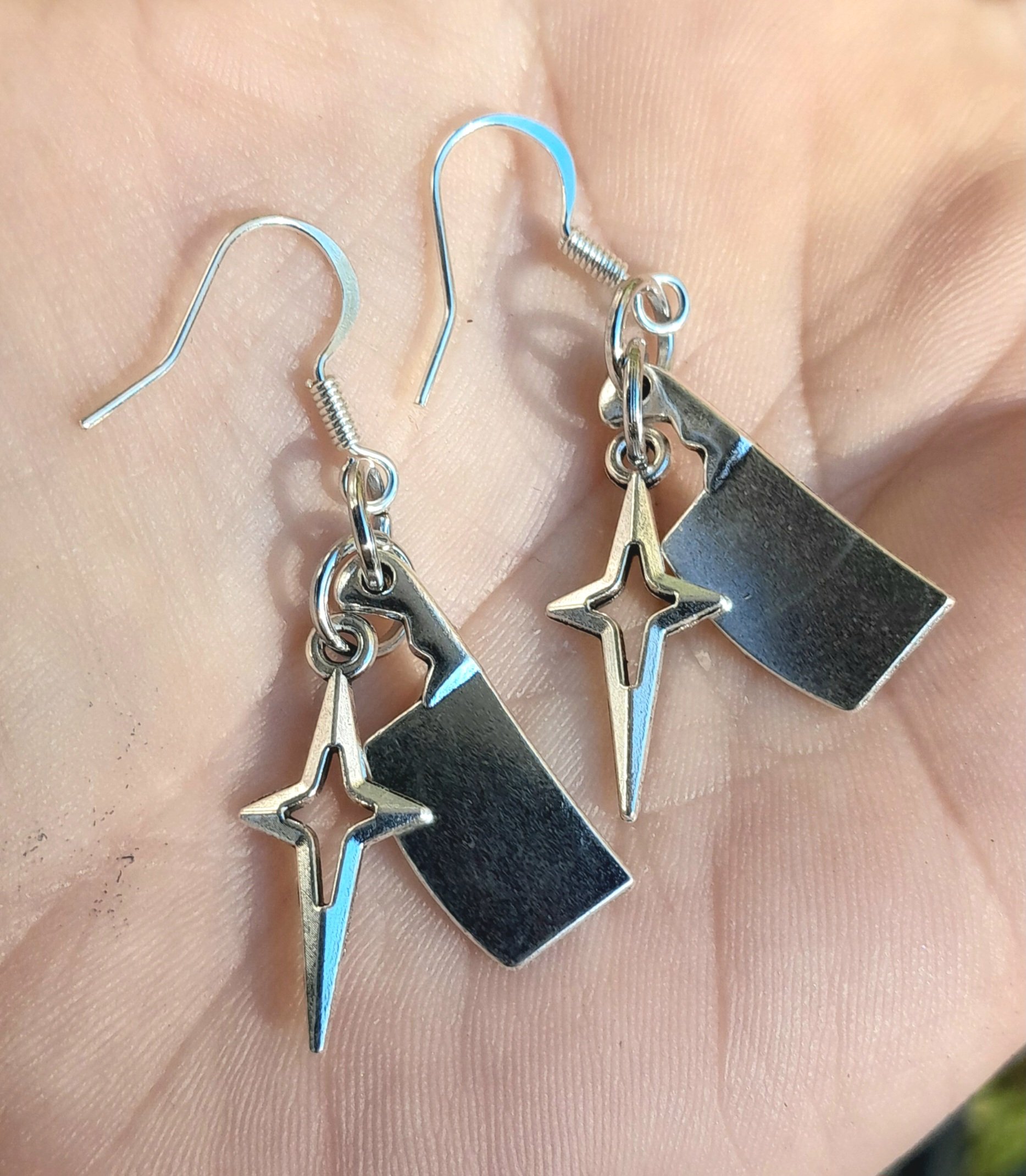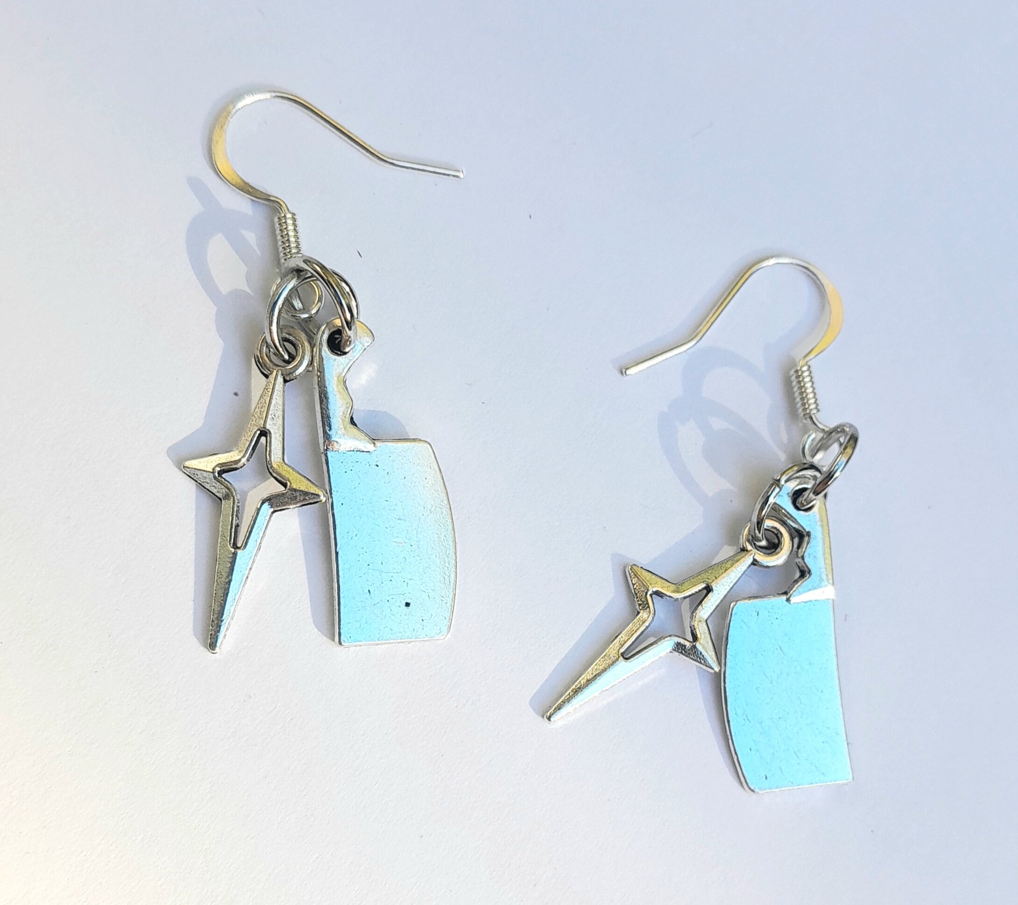 Pair of handmade earrings with stainless steel star and meat cleaver charms, jump rings and hooks.
