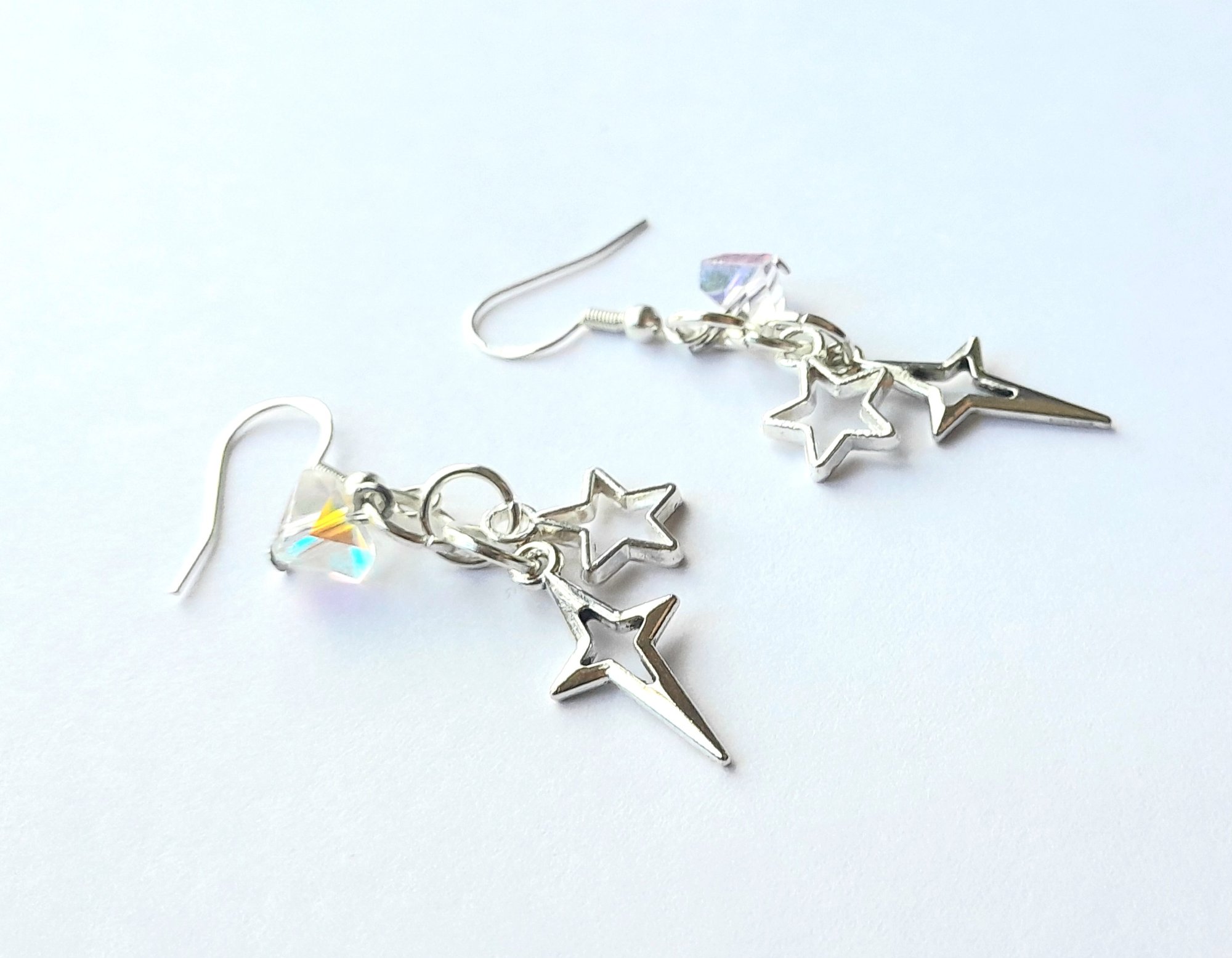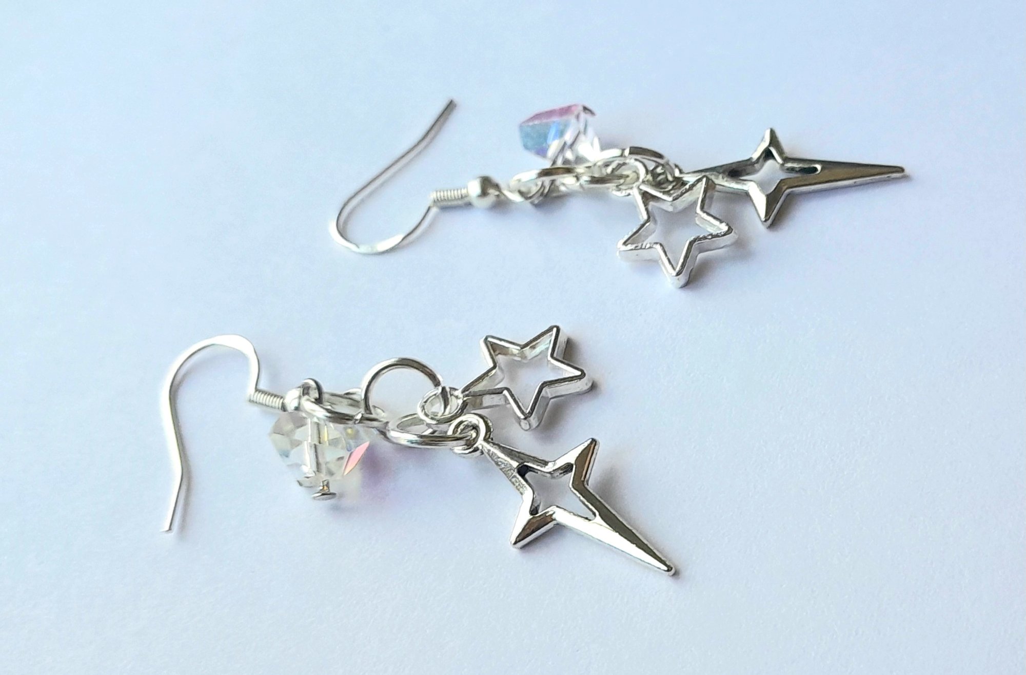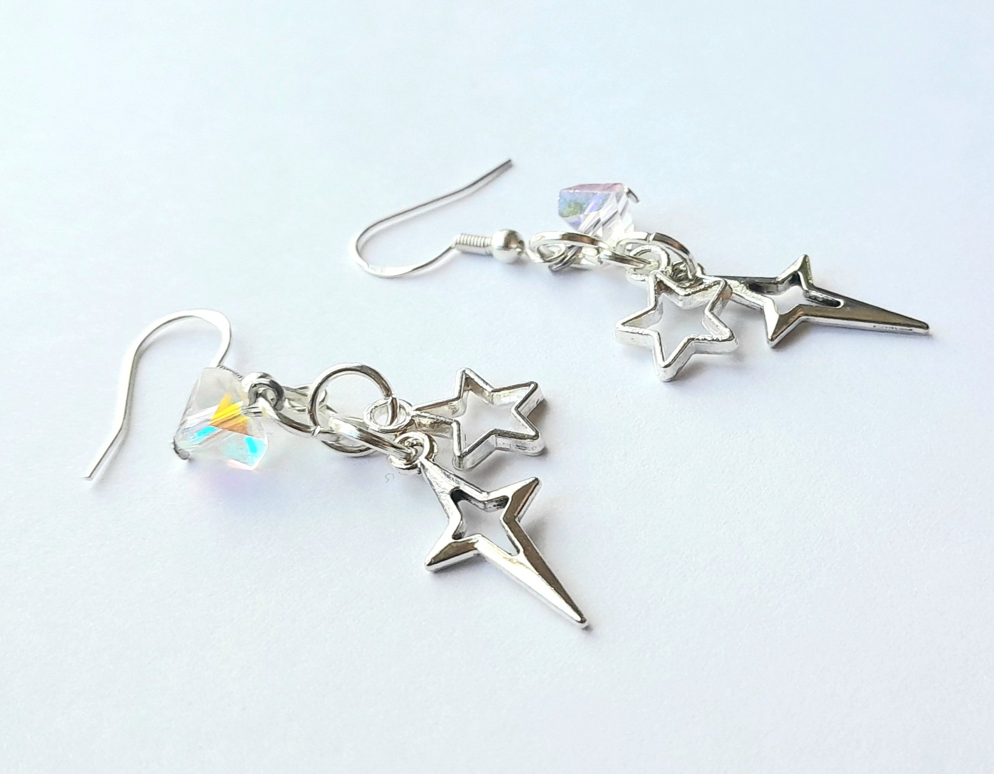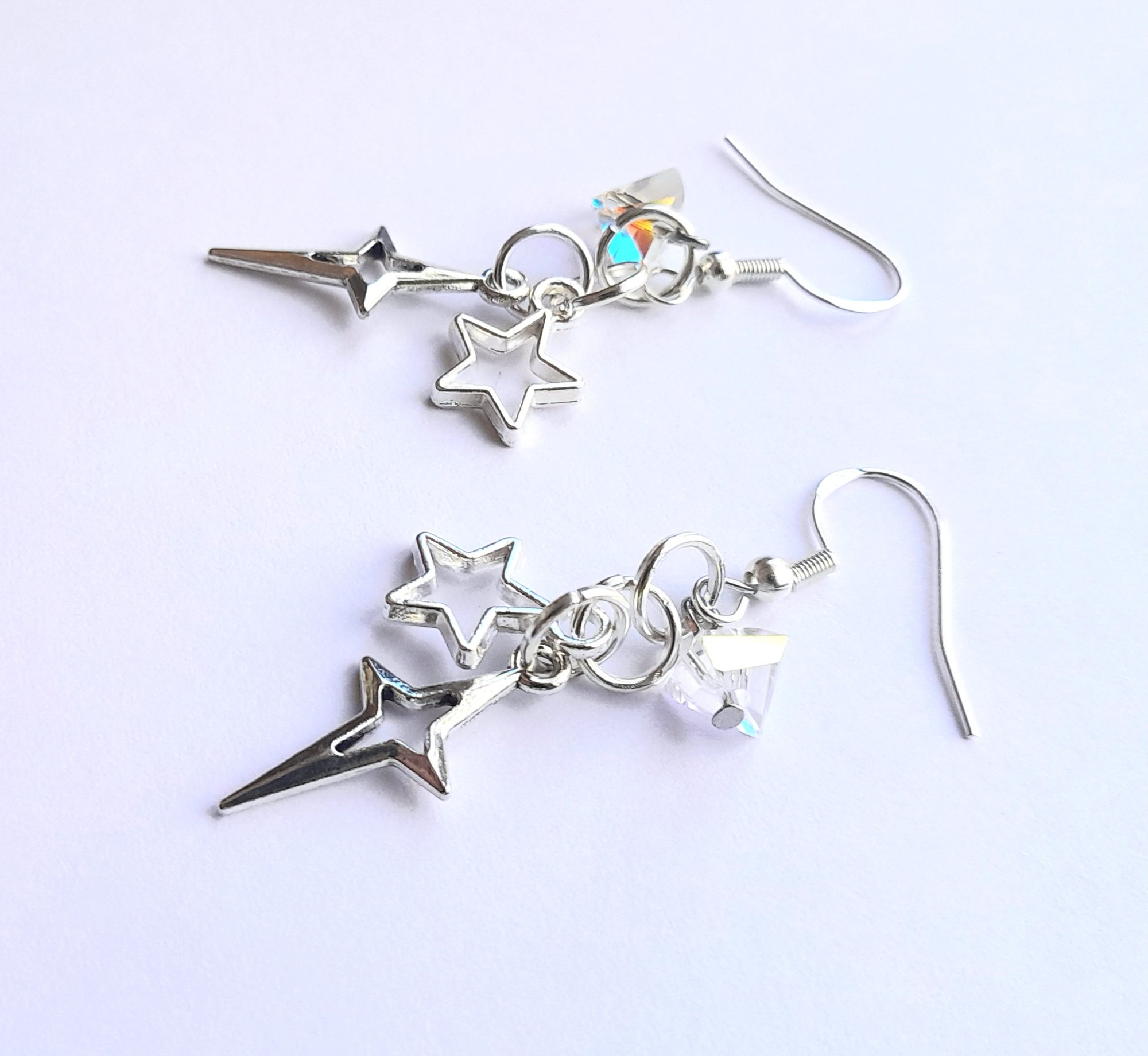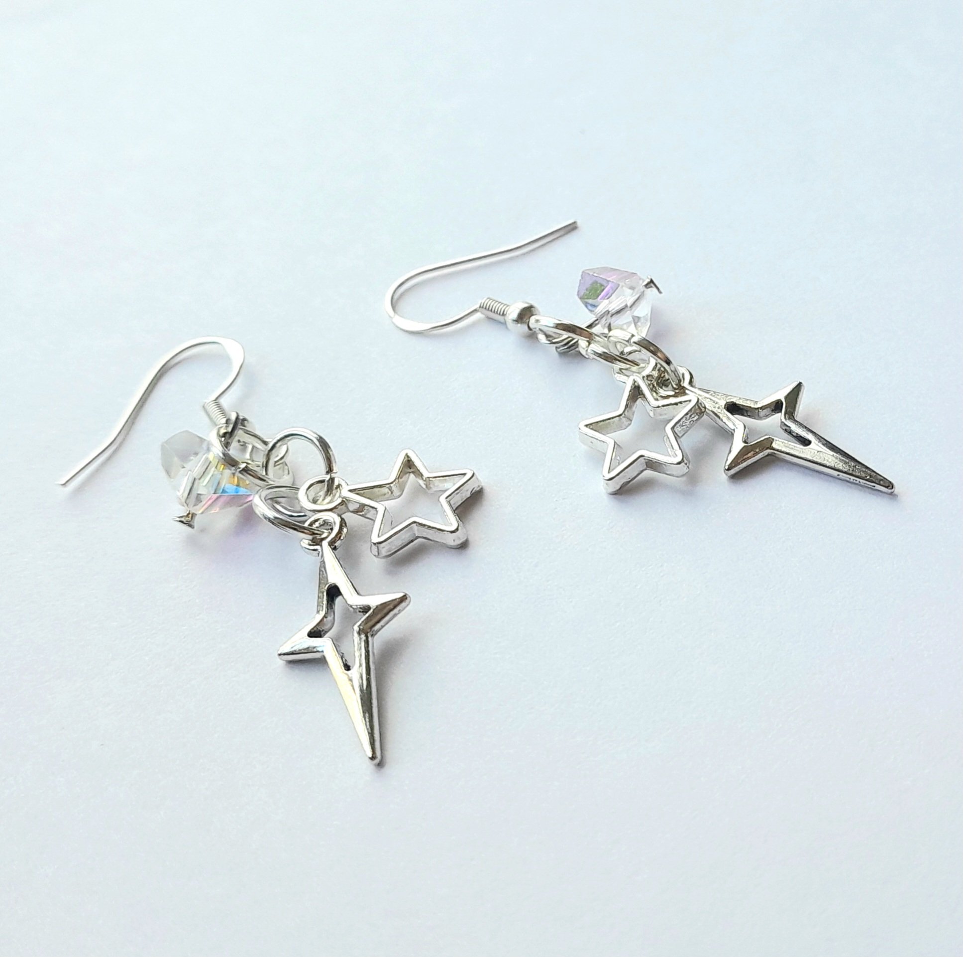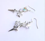 Pair of handmade earrings with iridescent glass beads, four and five pointed star charms, jump rings and sterling silver plated hooks.