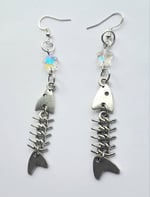 Pair of handmade earrings with silver metal fish skeleton charms, iridescent glass stars, jump rings and sterling silver plated hooks.