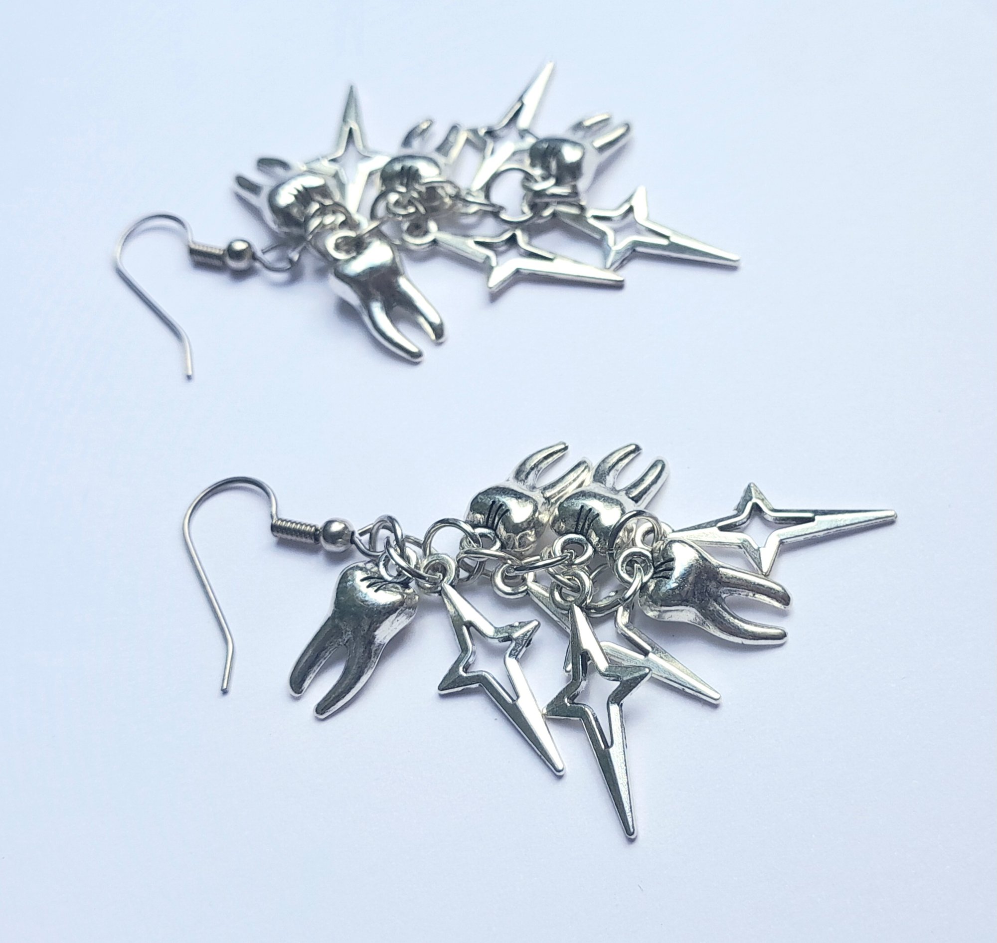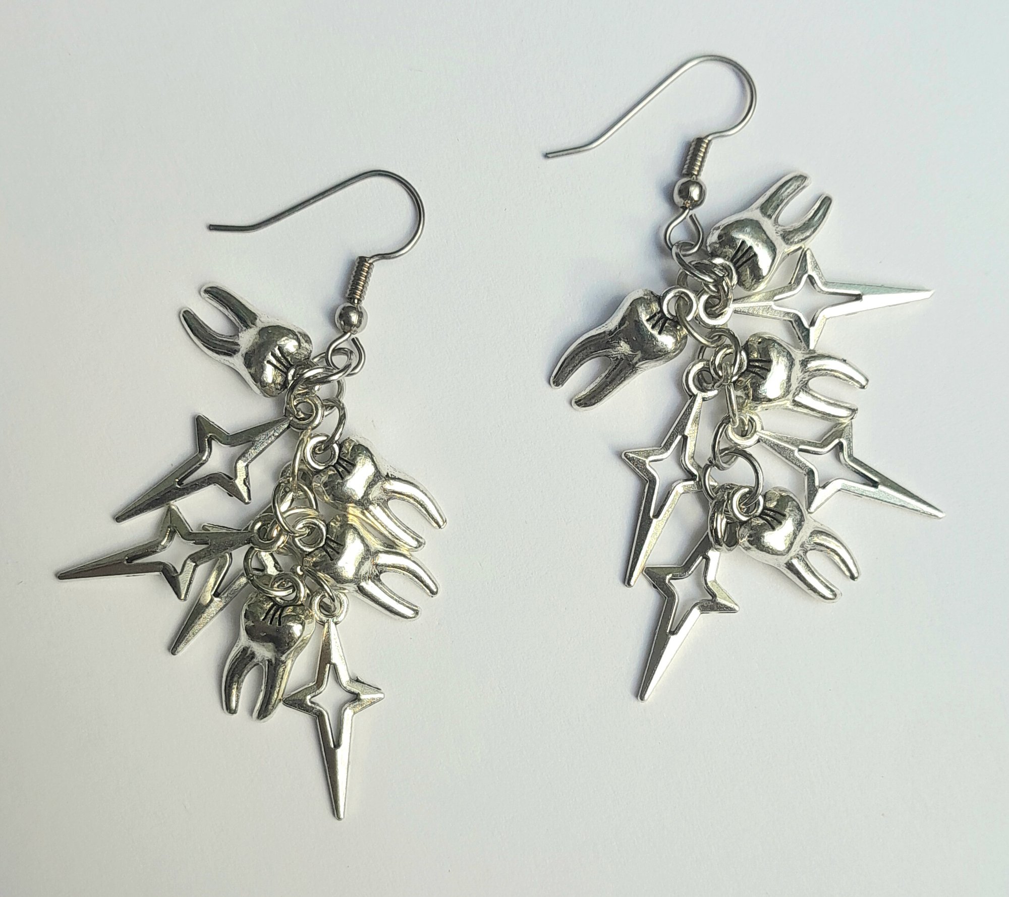 Pair of handmade earrings with stainless steel stars and teeth charms, jump rings and hooks.